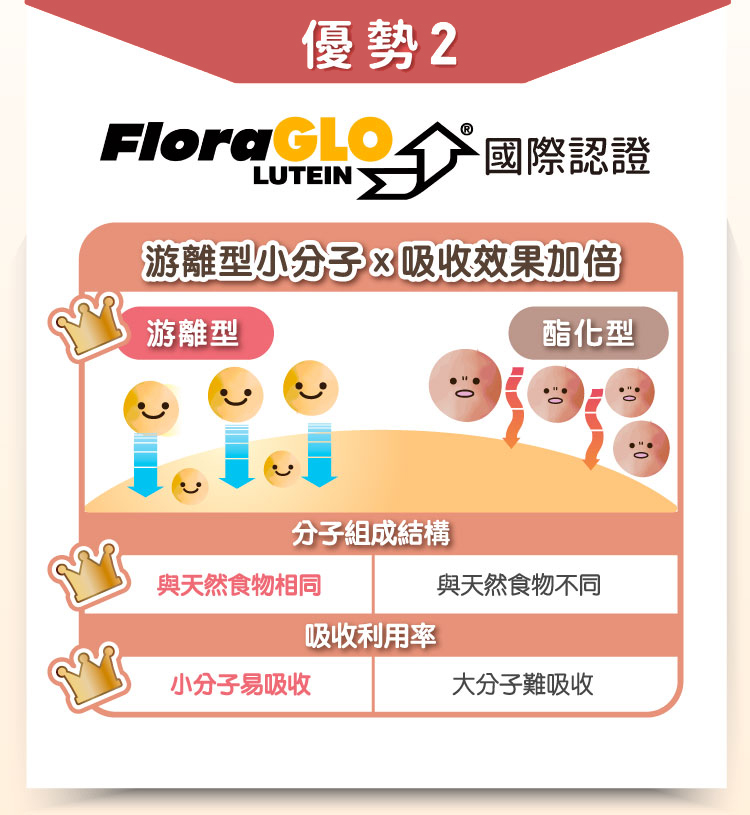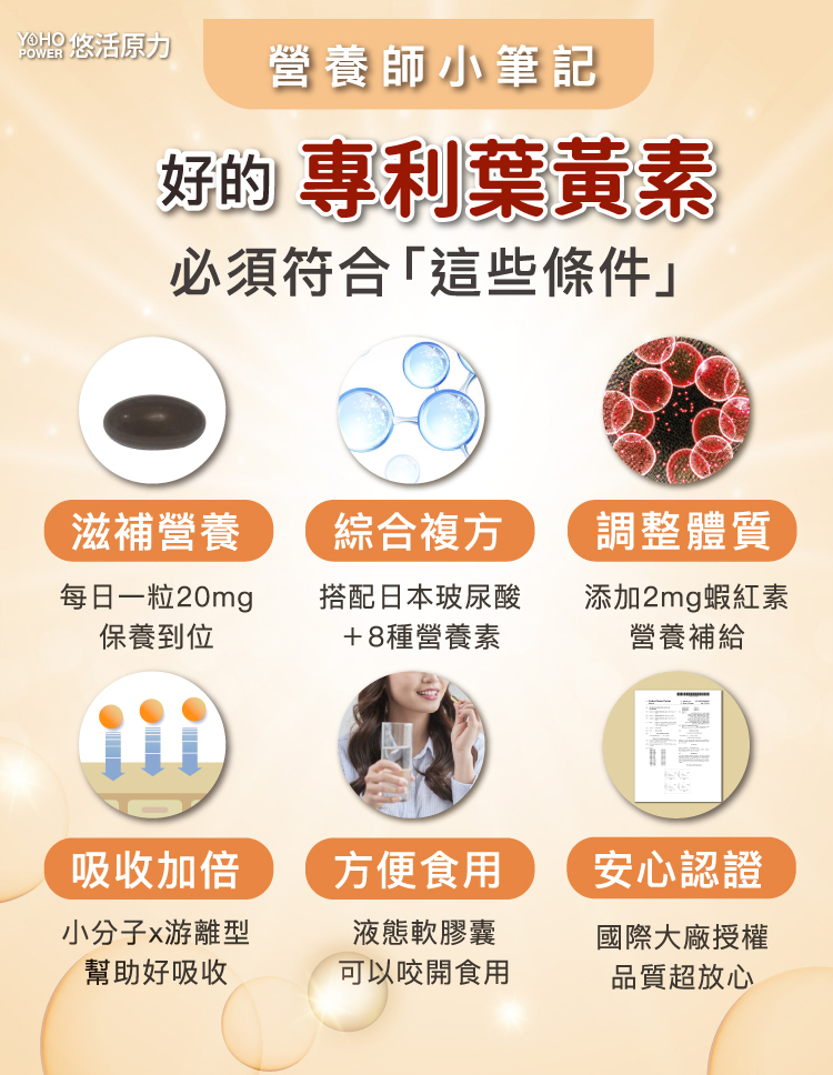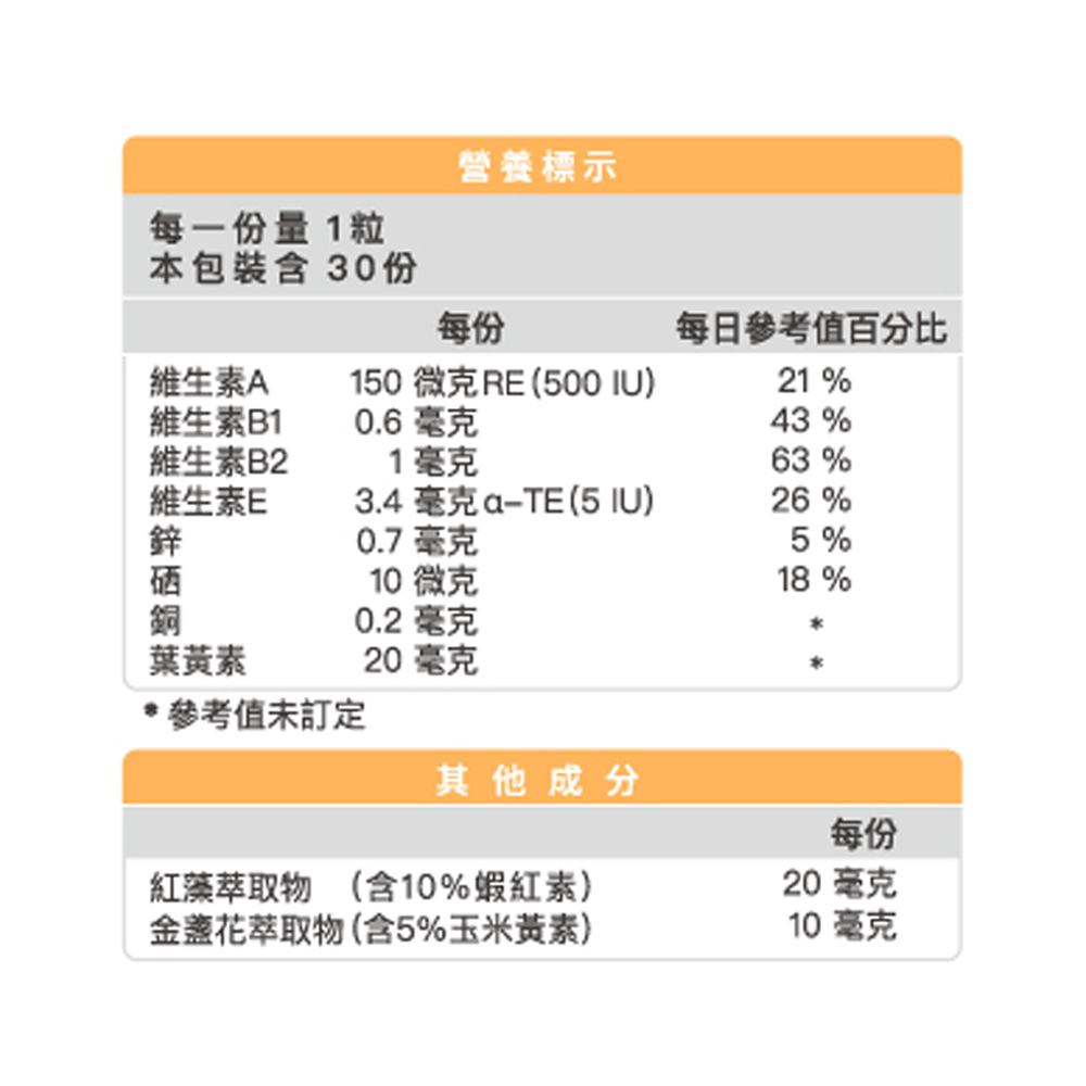 | 商品成分 | 中鏈三酸甘油酯、葉黃素20%(紅花籽油、葉黃素20%、生育醇(抗氧化劑))、N-乙醯基-D-葡萄糖胺、紅藻萃取物(橄欖油、蝦紅素10%)、脂肪酸甘油酯、金盞花萃取物(麥芽糊精、玉米黃素5%)、DHA藻油、葡萄糖酸鋅、硒酵母、維生素E(醋酸dl-α-生育醇酯)、雞冠萃取物(含透明質酸鈉)、維生素A棕櫚酸鹽油溶液(維生素A棕櫚酸鹽、花生油、生育醇(抗氧化劑))、核黃素(維生素B2)、葡萄糖酸銅、鹽酸硫胺明(維生素B1) 膠皮成分:明膠、甘油、純水、二氧化鈦、食用紅色四十號、食用黃色五號、食用藍色一號 |