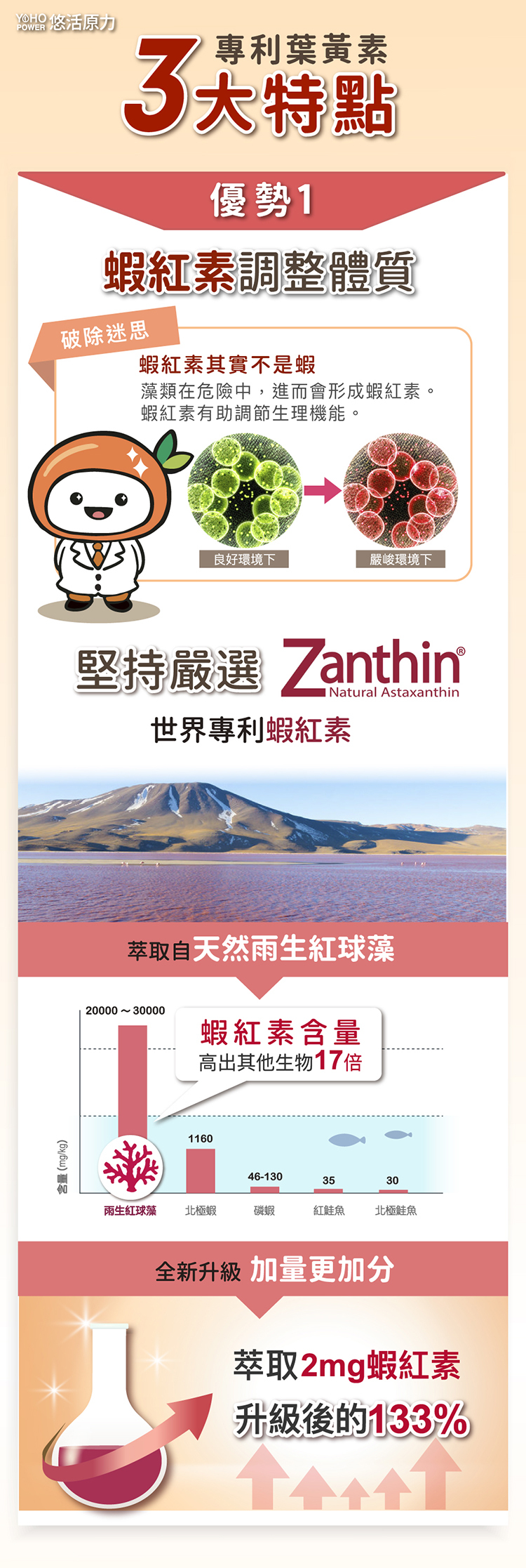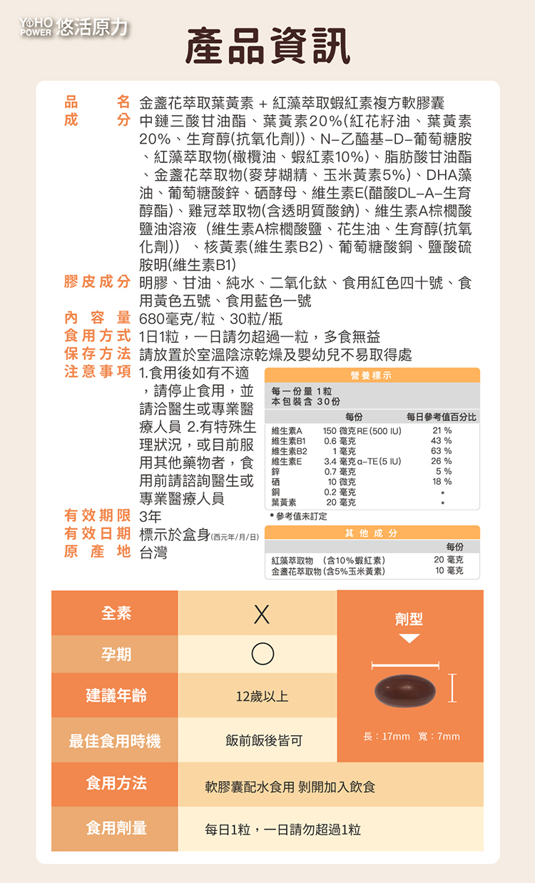 | 商品名稱 | 【悠活原力】金盞花萃取葉黃素+紅藻萃取蝦紅素複方軟膠囊 |