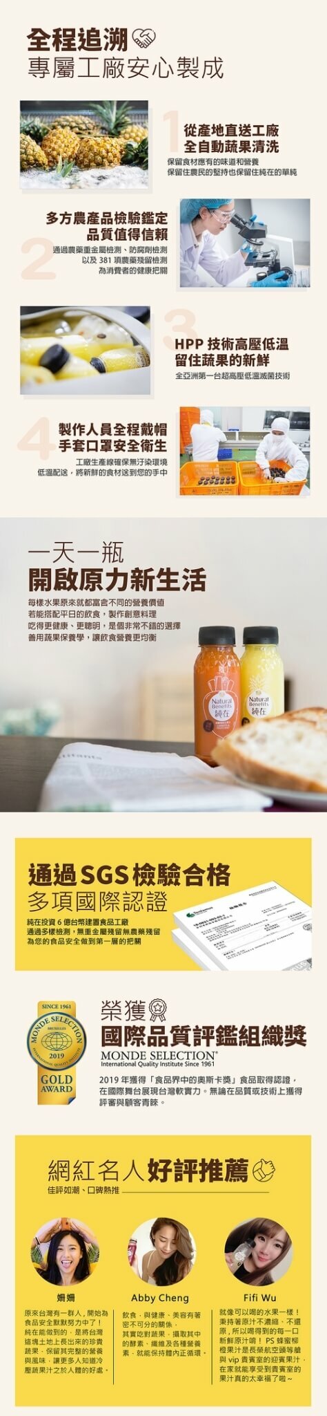 | 注意事項 | 本產品與其它含有芹菜類、芒果、奇異果、堅果、大豆製品、牛奶的產品共用同一產線生產,食物過敏者請留意 |