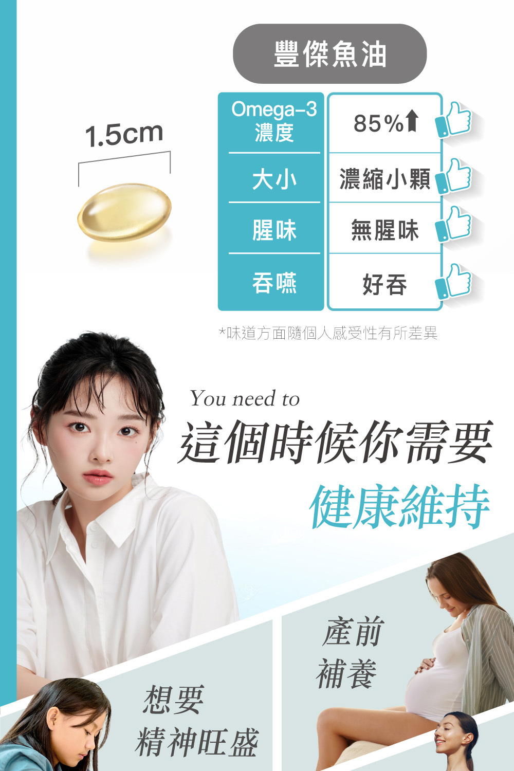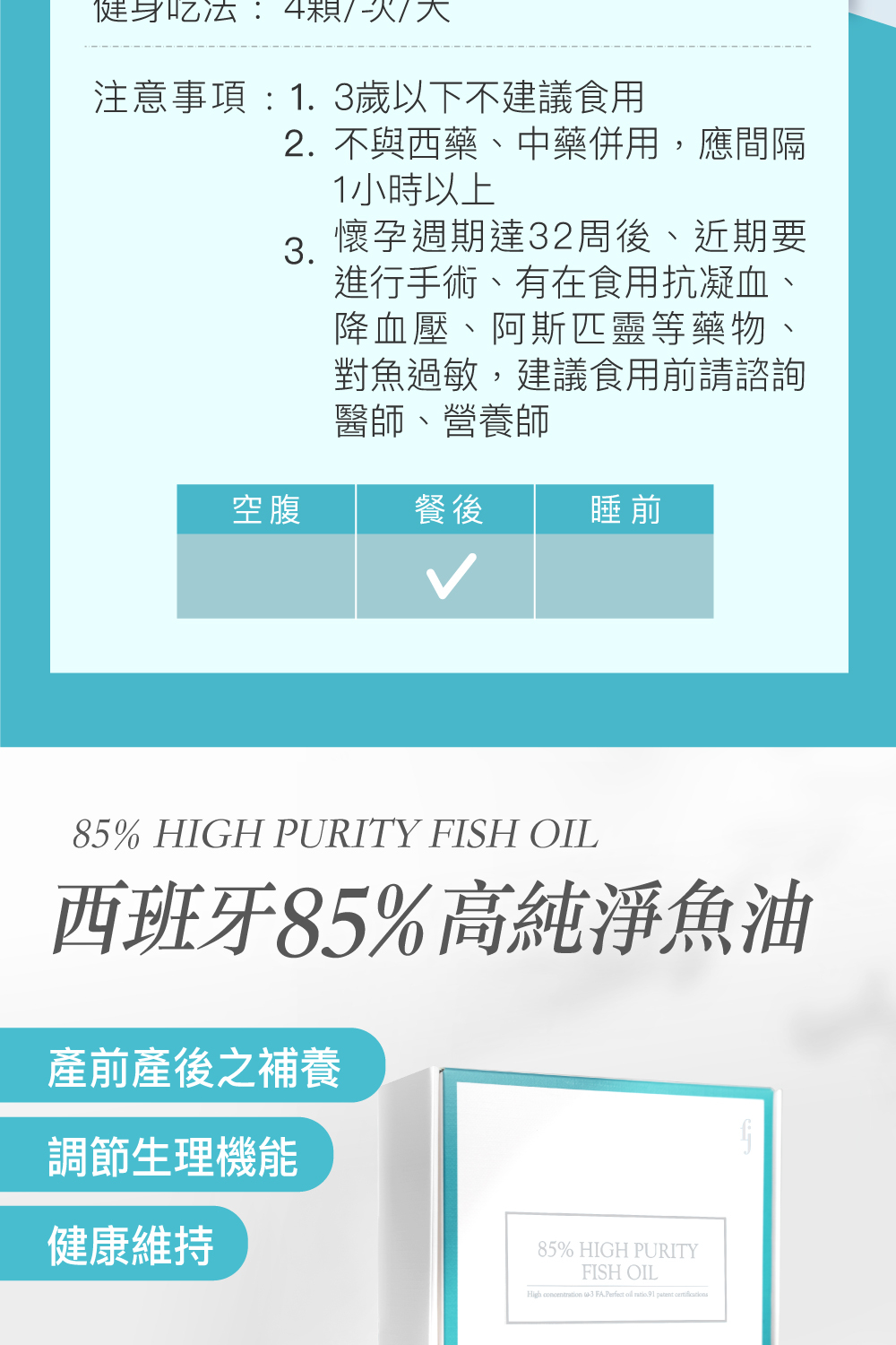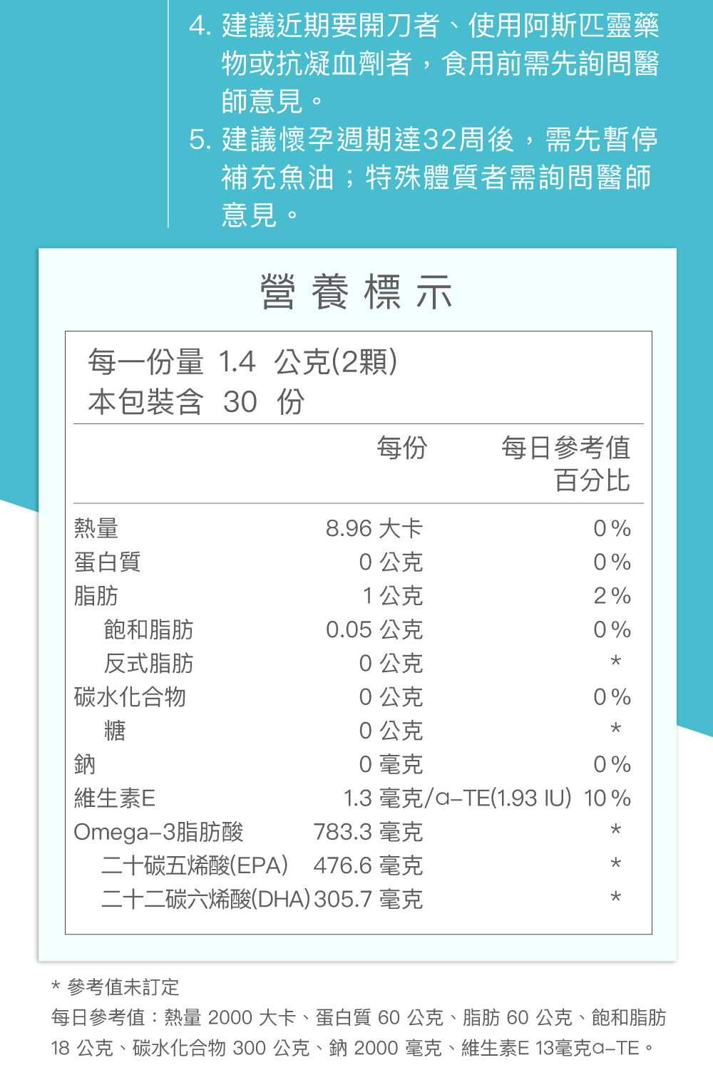 5. 建議懷孕週期達32周後,需先暫停補充魚油;特殊體質者需詢問醫師意見。