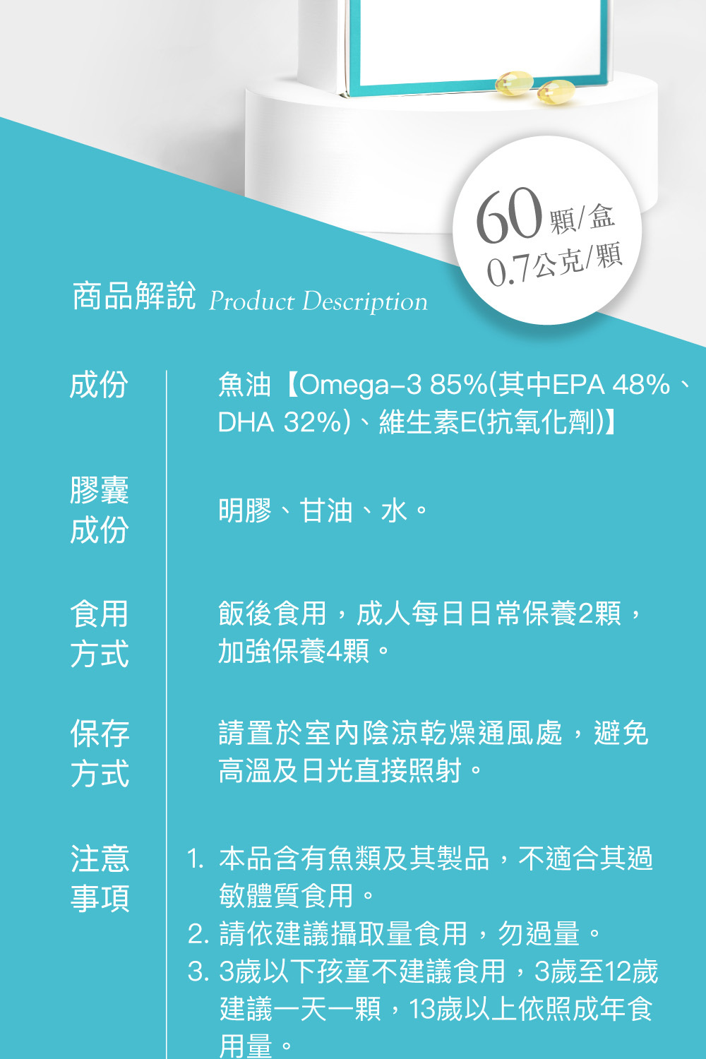 | 商品成分 | 魚油【Omega-3 85%(其中EPA 48%、DHA 32%)、維生素E(抗氧化劑)】 |