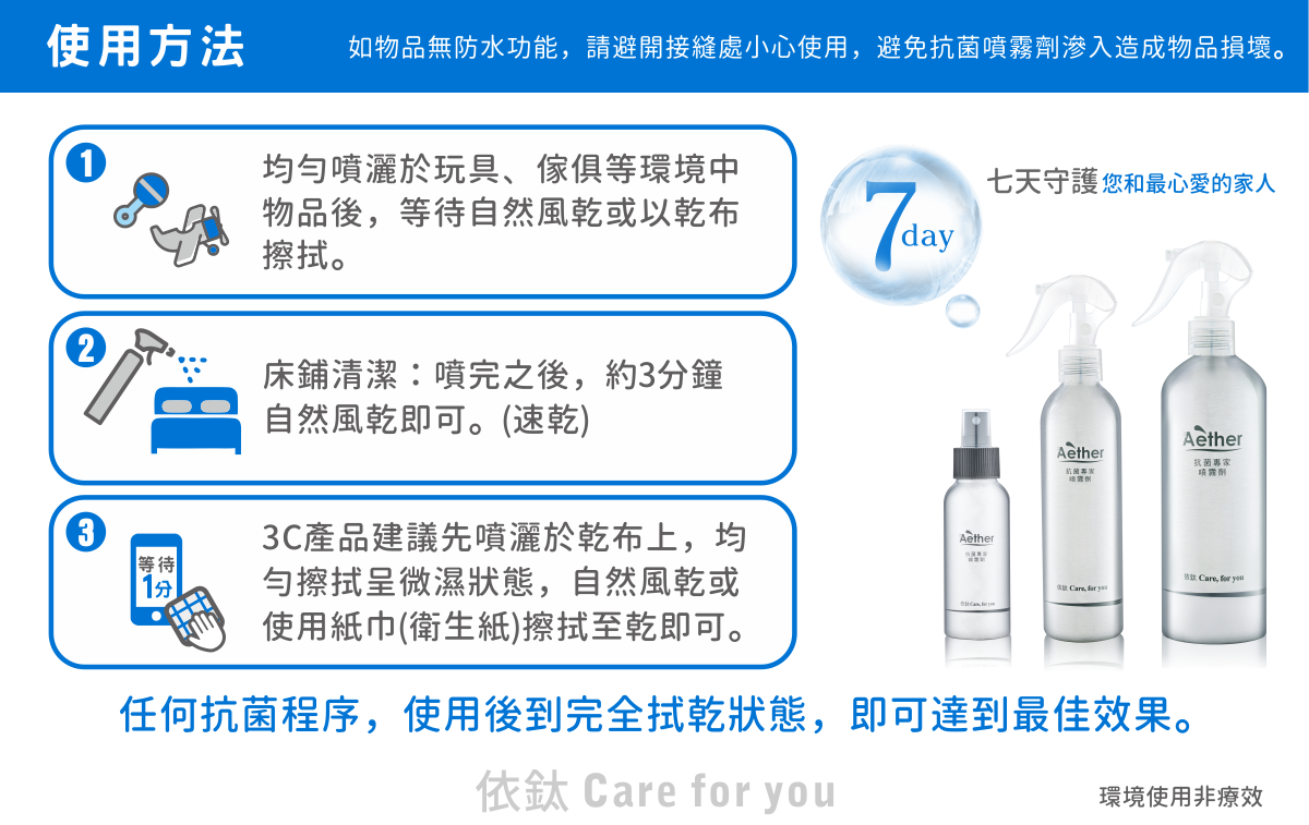 使用方式 均勻噴灑於目標物,待自然風乾或以乾布擦拭即可