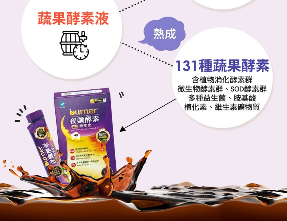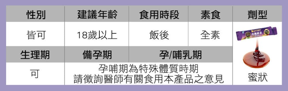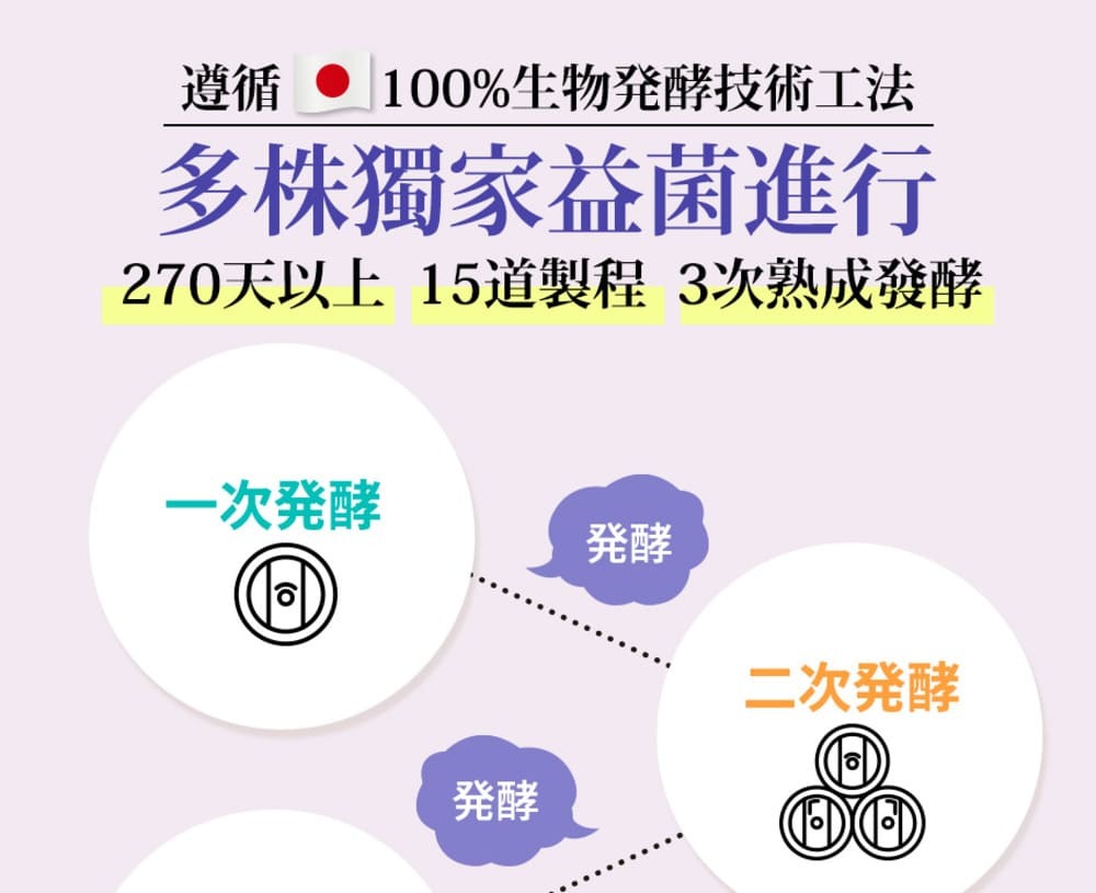 | 注意事項 | 1.本產品由多種蔬果發酵而來,並含有芒果、芝麻、奇異果、大豆及其製品,不是盒過敏體質者。若出現不適或過敏反應,應立即停止食用。 2.生理期、孕哺期、孩童及特殊體質者,食用前請先諮詢醫師、藥師、營養師等專業人士。
