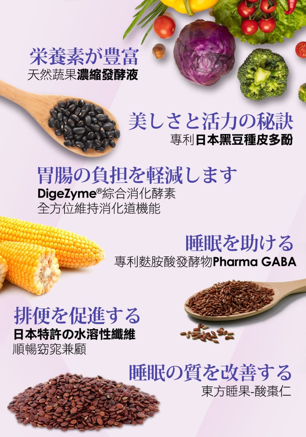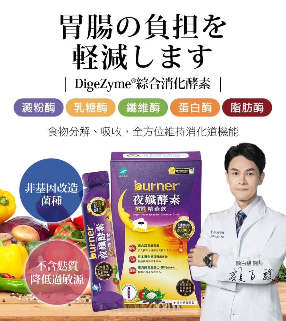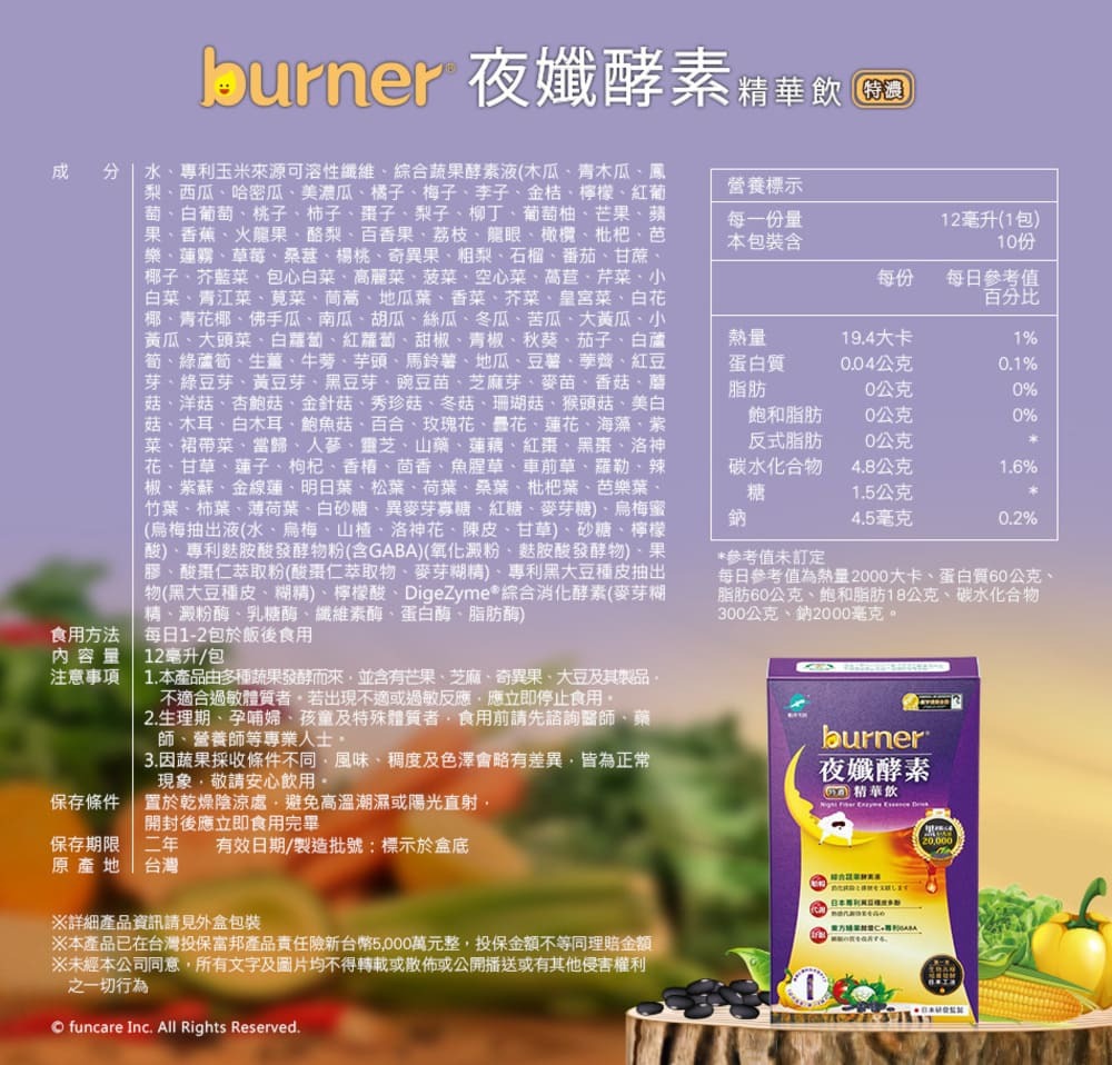 | 商品規格 | 12ml/包,10包/盒水、專利玉米來源可溶性纖維、綜合蔬果發酵液(木瓜、青木瓜、鳳梨、西瓜、哈密瓜、美濃瓜、橘子、梅子、李子、金桔、檸檬、紅葡萄、白葡萄、桃子、柿子、棗子、梨子、柳丁、葡萄柚、芒果、蘋果、香蕉、火龍果、酪梨、百香果、荔枝、龍眼、橄欖、枇杷、芭樂、蓮霧、草莓、桑葚、楊桃、奇異果、石榴、番茄、甘蔗、椰子、芥藍菜、包心白菜、高麗菜、菠菜、空心菜、萵苣、芹菜、小白菜、青江菜、莧菜、茼蒿、地瓜葉、香菜、芥菜、皇宮菜、白花椰、青花椰、佛手瓜、南瓜、胡瓜、絲瓜、冬瓜、苦瓜、大黃瓜、小黃瓜、大頭菜、白蘿蔔、紅蘿蔔、甜椒、青椒、秋葵、茄子、白蘆筍、綠蘆筍、生薑、牛蒡、芋頭、馬鈴薯、地瓜、豆薯、荸薺、紅豆芽、綠豆芽、黃豆芽、黑豆芽、豌豆苗、芝麻芽、麥苗、香菇、蘑菇、洋菇、杏鮑菇、金針菇、秀珍菇、冬菇、珊瑚菇、猴頭菇、美白菇、木耳、白木耳、鮑魚菇、百合、玫瑰花、曇花、蓮花、海藻、紫菜、裙帶菜、當歸、人蔘、靈芝、山藥、蓮藕、紅棗、黑棗、洛神花、甘草、蓮子、枸杞、香椿、茴香、魚腥草、車前草、羅勒、辣椒、紫蘇、金線蓮、明日葉、松葉、荷葉、桑葉、枇杷葉、芭樂葉、竹葉、柿葉、薄荷葉、白砂糖、異麥芽寡糖、紅糖、麥芽糖)、烏梅蜜(烏梅萃取液、砂糖、仙楂抽出液(山楂、甘草、洛神花、陳皮)、香料、檸檬酸、焦糖色素)、專利麩胺酸發酵物(含GABA)、果膠、酸棗仁萃取物、專利黑大豆種皮抽出物(黑大豆種皮、糊精)、檸檬酸、DigeZyme☆綜合酵素(麥芽糊精、α-澱粉酶、乳糖酶、纖維酶、中性蛋白酶、脂肪酶) |