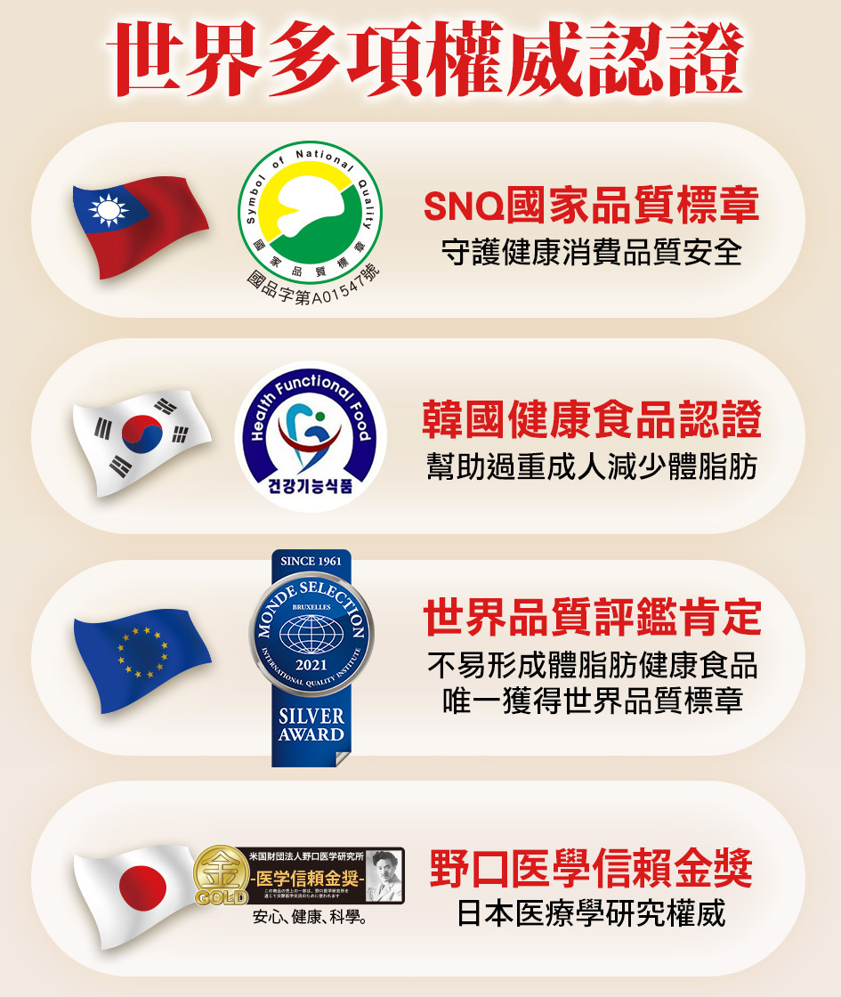 | 注意事項 | 1.請洽詢醫師或營養師有關食用本品之意見。 2.在嚴謹的營養均衡與熱量控制,以及適當的運動條件下,適當攝取本產品有助於不易形成體脂肪。 3.本產品為健康食品,不具治療矯正任何疾病,有療者仍需就醫。 4.本產品含有牛奶及其製品,不適合其過敏體質者食幅。 5.一日請勿超過4顆,多食無益。 |