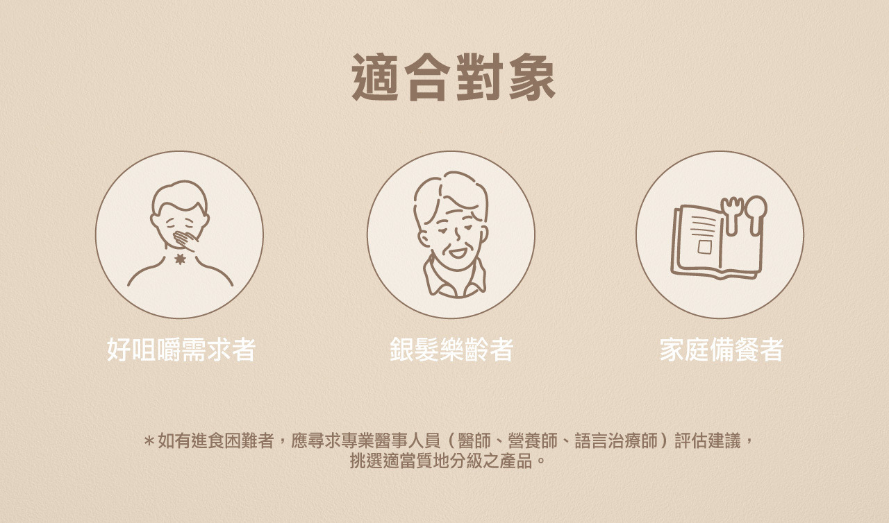 牙口不佳、咀嚼困難或是喝果汁會嗆咳的長輩、銀髮樂齡者、齒顎矯正恢復期、1~99歲者等皆適合。