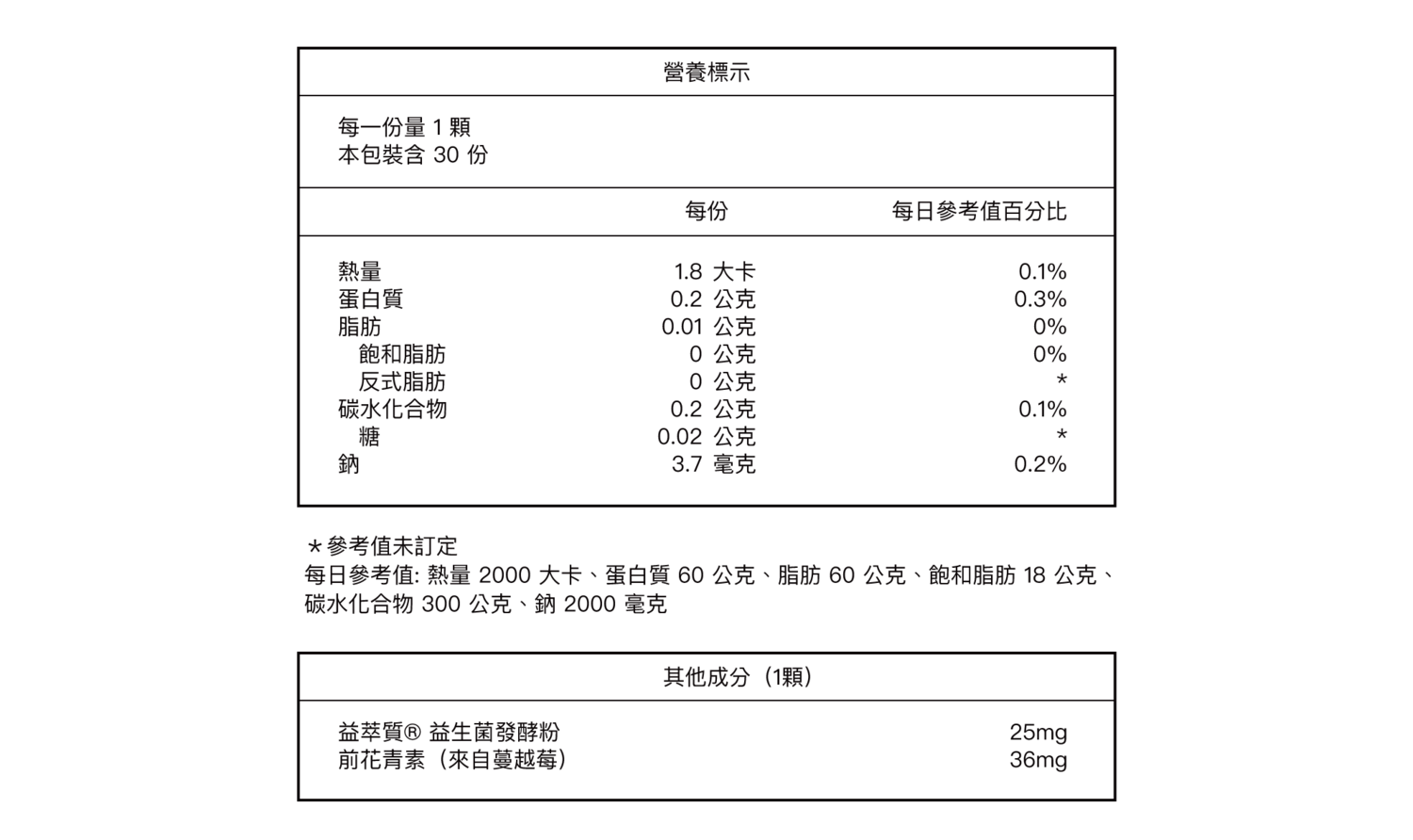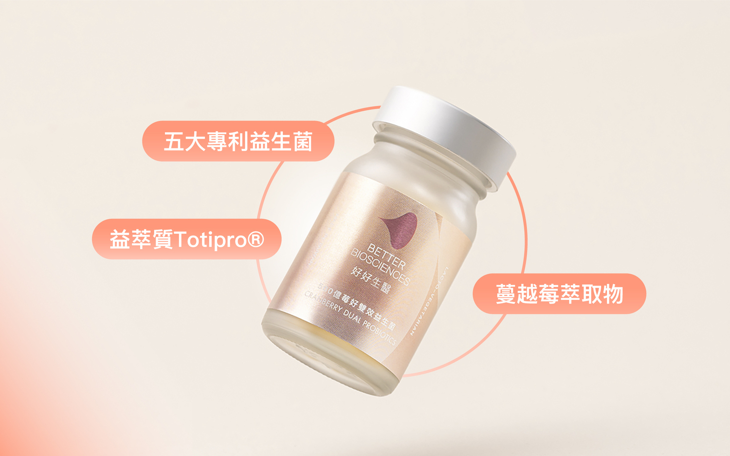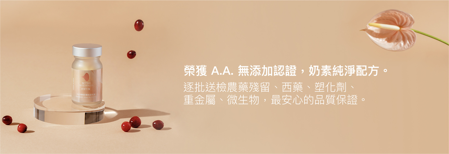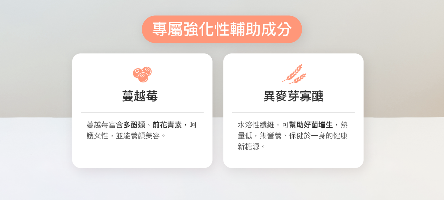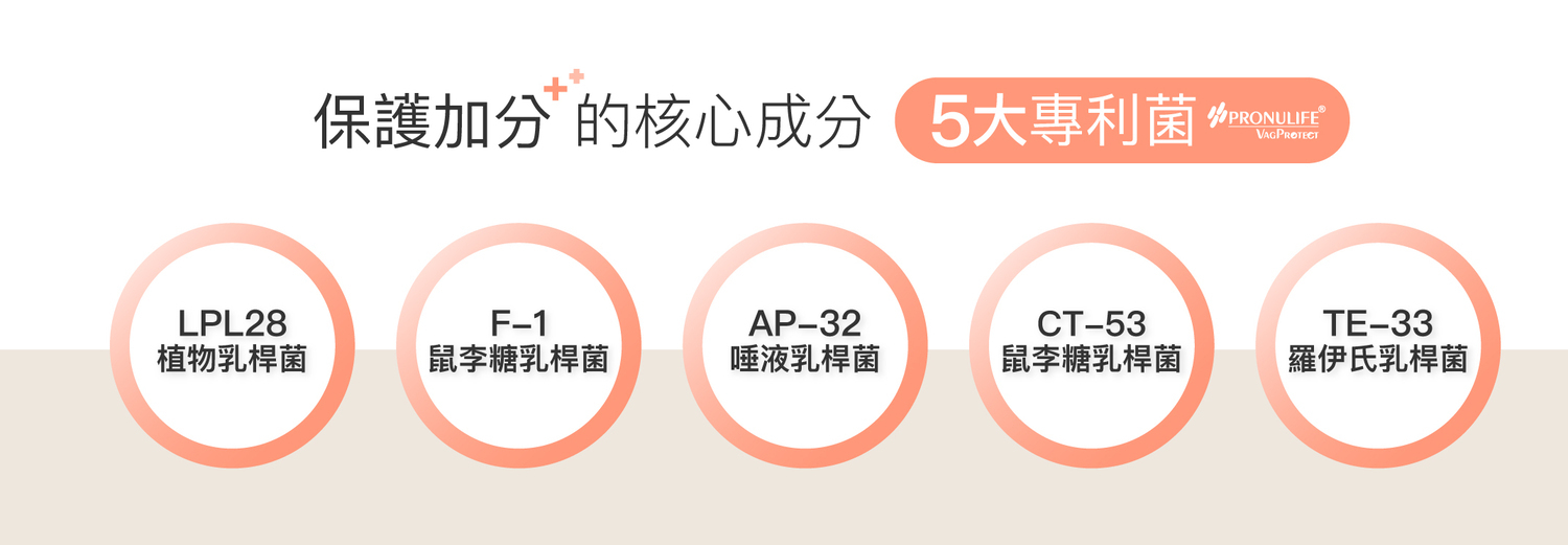 成分:乳酸菌(植物乳桿菌LPL28、鼠李糖乳桿菌F-1&CT-53、唾液乳桿菌AP-32、羅伊氏乳桿菌ET-33)、玉米澱粉、麥芽糊精、異麥芽寡醣、蔓越莓萃取物、益萃質®益生菌發酵粉、二氧化矽