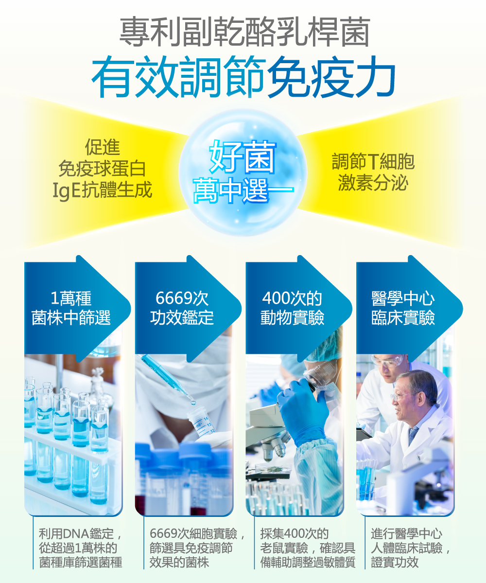 每顆含50億專利副乾酪乳桿菌益生菌,為萬中選一具有免疫調整功效的本土活菌