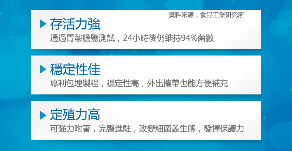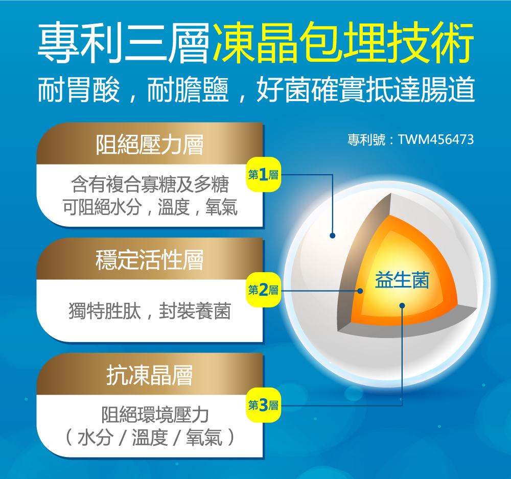 製程上使用專利凍乾包埋技術,益生菌經三層包埋及凍晶乾燥技術,增加益生菌穩定性