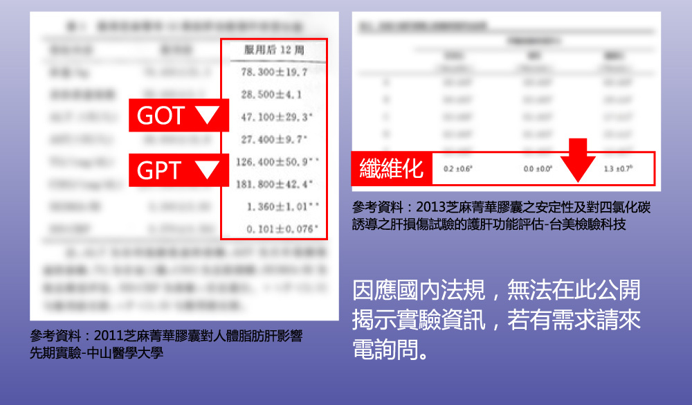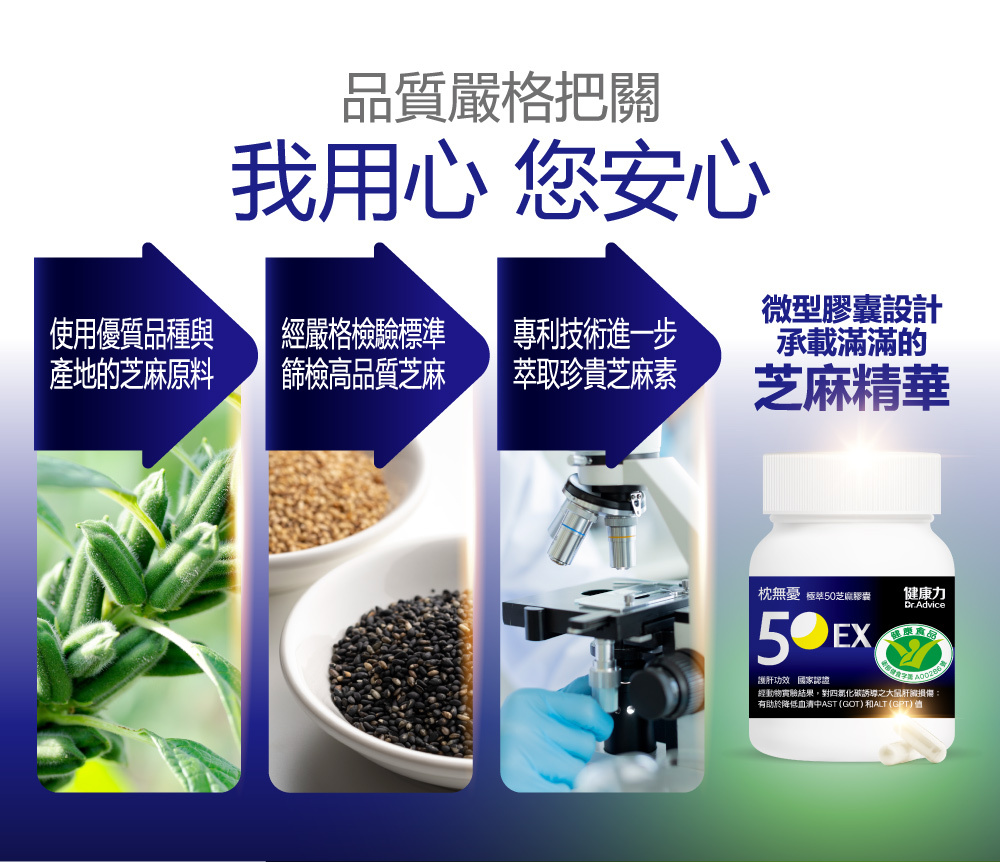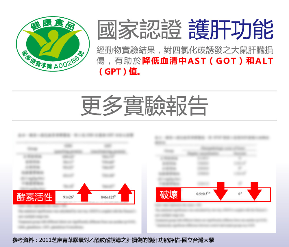 | 注意事項 | 本產品非藥品,供保健用,罹病者仍需就醫。請依建議攝取量食用,勿過量。均衡飲食及適當運動是身體健康的基礎,請洽詢醫師或營養師有關食用本產品之意見。本產品含有芝麻抽出物及乳糖,膠囊殼含有明膠,為牛來源成分,故產品屬葷食。ASTGOT和ALTGPT值持續異常升高可能是肝病變所引起,請立即就醫。體質特殊,懷孕及小孩,請諮詢醫師或營養師 |