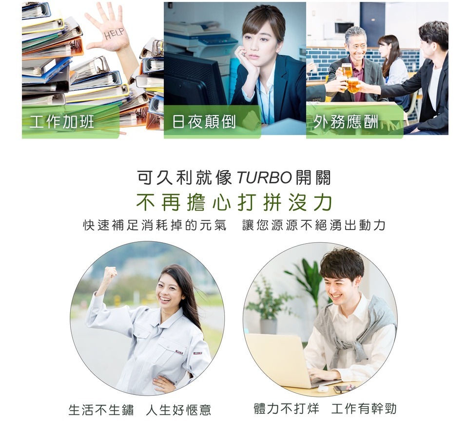 | 適用對象 | 1.忙碌壓力大的上班族、K書熬夜的學生族 2.產品不離身的平板族、手機族 3. 從事生產線作業體力勞動工作者 4. 有抽菸、喝酒或嚼檳榔習慣者 |