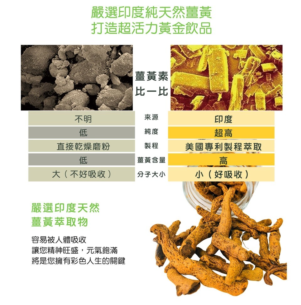 | 注意事項 | 1.沖泡時,盡量在攪拌後儘速喝完。底部沉澱的部分是關華豆膠,也是膳食纖維的一種,請安心食用。沖泡後放置一段時間會有一層薑黃萃取物浮在上面,這是因為薑黃萃取物是油溶性的,此為正常現象。 2.對穀胱甘肽過敏者、孕婦、哺乳婦女及嬰幼兒應避免食用。 3.本產品含有大豆相關製品。 |