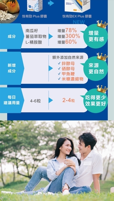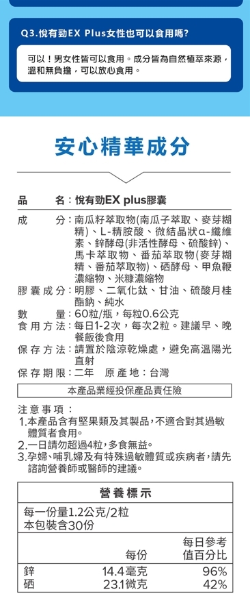 | 商品成分 | 南瓜籽萃取物(南瓜子萃取、麥芽糊精)、L-精胺酸、微結晶狀α-纖維素、鋅酵母(非活性酵母、硫酸鋅)、馬卡萃取物、番茄萃取物(麥芽糊精、番茄萃取物)、硒酵母、甲魚鞭濃縮物、米糠濃縮物 |