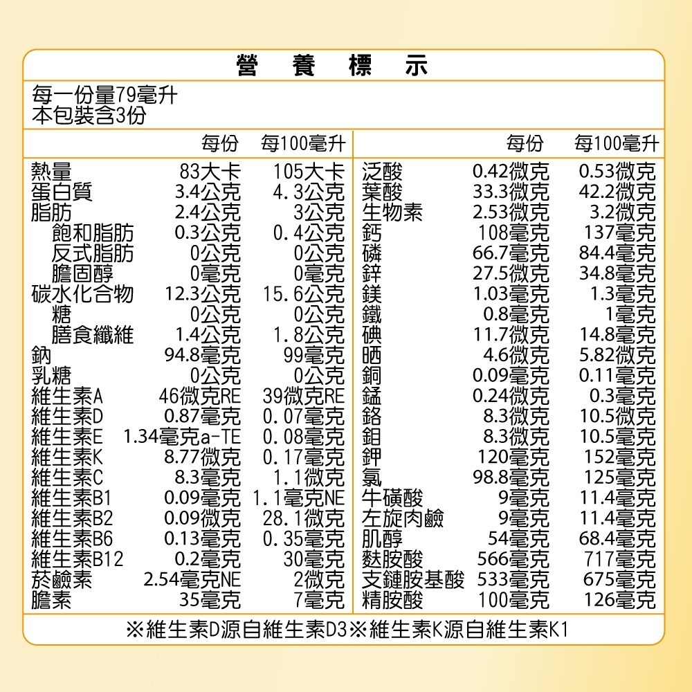| 商品成分 | 水、麥芽糊精、芥花油、乾酪素鈣、難消化性麥芽糊精、乾酪素鈉、綜合礦物質[檸檬酸鈉、檸檬酸鈣、磷酸鎂、氯化鉀、磷酸鈣、檸檬酸鉀、磷酸鉀、硫酸錳(麥芽糊精、硫酸錳)、鉬酵母、硫酸鋅、硫酸亞鐵、硒酵母、三氯化鉻(麥芽糊精、三氯化鉻)、硫酸銅]、分離大豆蛋白、香料[香草香料(葡萄糖、香料、二氧化矽)、牛奶香料]、乳清蛋白、菊糖、綜合維生素[肌醇、磷酸鈣、抗壞血酸、牛磺酸、抗壞血酸鈉、維生素E(維生素E、麥芽糊精、玉米澱粉、二氧化矽)、菸鹼醯胺、葉酸(麥芽糊精、葉酸)、維生素A粉末、本多酸鈣、生物素(麥芽糊精、生物素)、維生素D3、維生素B12(麥芽糊精、維生素B12)、維生素K1(阿拉伯膠、蔗糖、維生素K1)、維生素B6、碘化鉀(麥芽糊精、碘化鉀)、維生素B1、維生素B2]、中鏈三酸甘油酯、乳化劑(脂肪酸甘油酯、乳酸硬脂酸鈉、脂肪酸蔗糖酯)、磷酸氫二鉀、氯化膽鹼(氯化膽鹼、抗壞血酸鈉)、鹿角菜膠(鹿角菜膠、蔗糖)、L-肉酸。 |