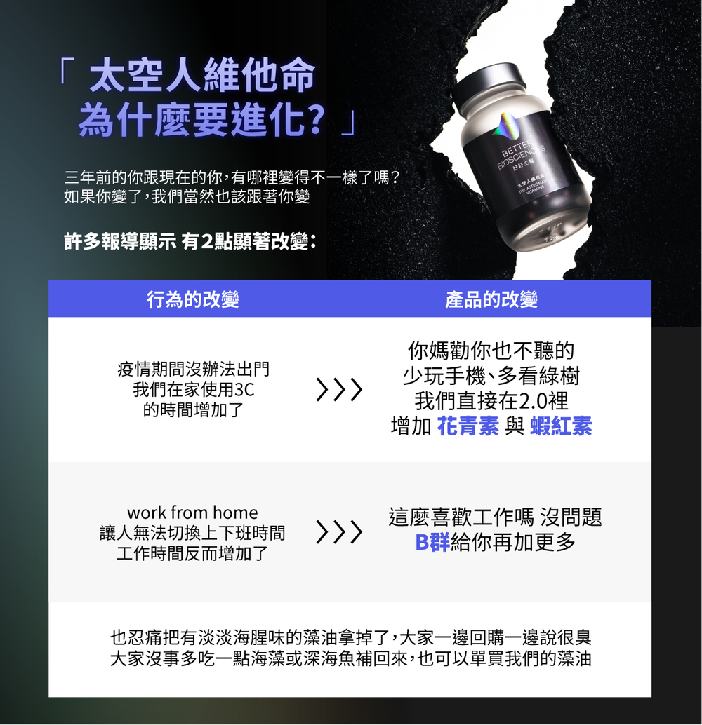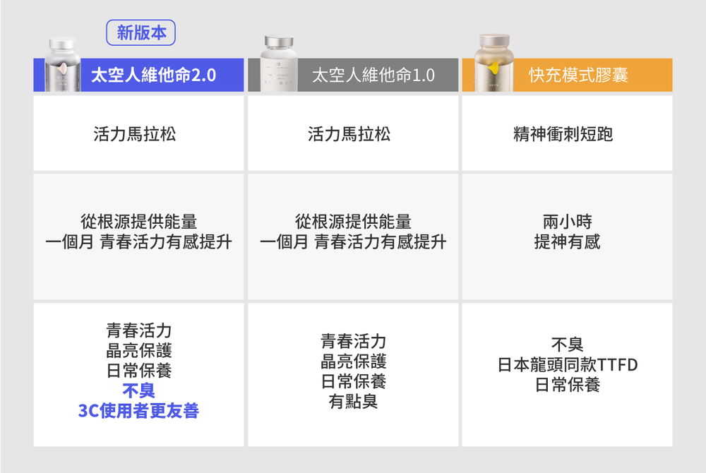 我們針對現代高效生活,添加許多比一般綜合維他命更精準的成分,包含青春之母SOD酵素、日本研製輔酵素Q10、晶亮元素葉黃素、玉米黃素、蝦紅素、花青素等,一次補充高效率生活所需要的營養。經過百人體驗,93%試吃者表示有感提振精神。