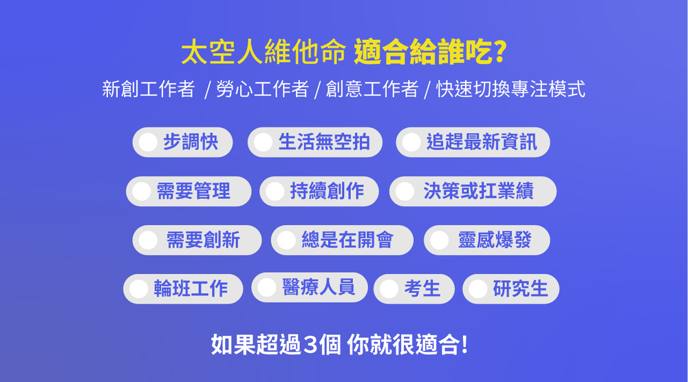 如果你從事的是正常的運動頻率與強度,甚至是有氧運動,都適合補充太空人維他命