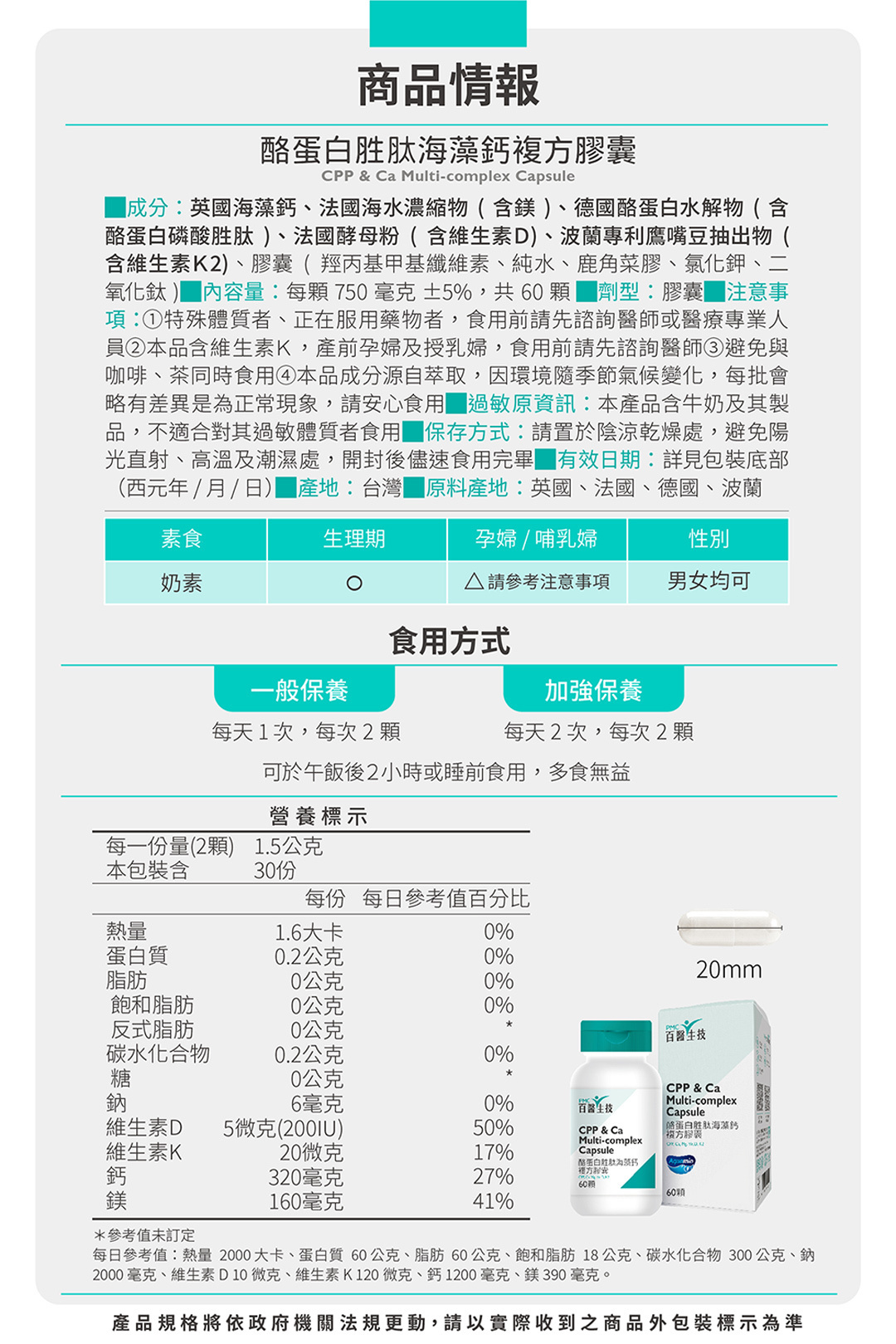 | 商品成分 | 英國海藻鈣、法國海水濃縮物、德國酪蛋白磷酸胜肽、歐洲酵母粉、波蘭鷹嘴豆抽出物、膠囊(羥丙基甲基纖維素、純水、鹿角菜膠、二氧化鈦、氯化鉀) |