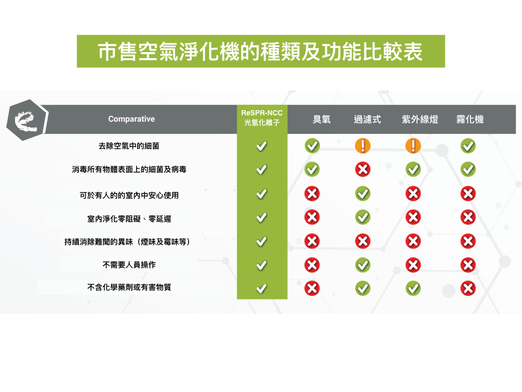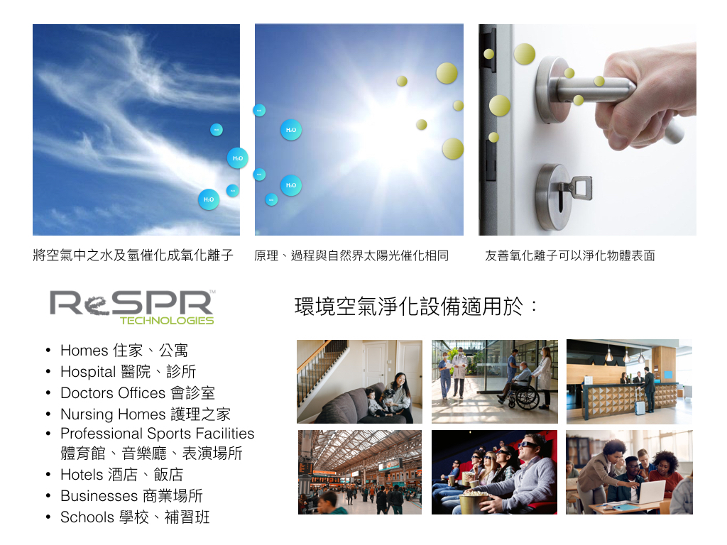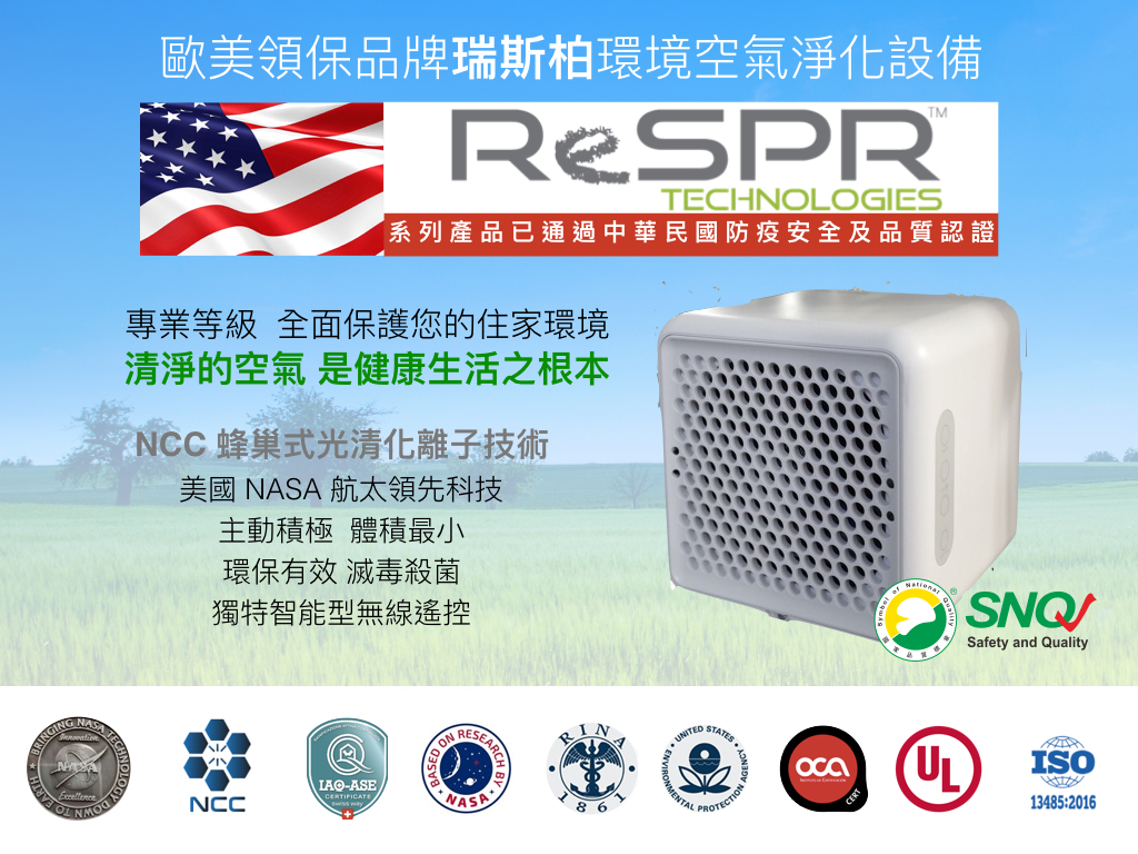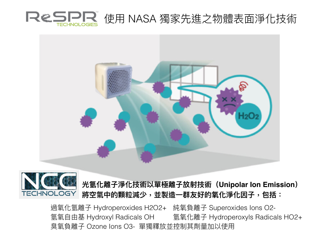跨時代除菌技術|實證能有效撲滅空氣中及物體表面上之細菌,包含冠狀病毒 COVID-19 達99.9% 歐盟一級醫療級別驗證,可以主動分解室內物體表面及空氣中的各種有害污染物,同時獲美國威斯康辛大學測試證實,有效撲滅病毒達 99.99% 以上,包含細菌、黴菌、及病毒(新冠病毒 COVID-19,MARS,HIN,H5N9,H5N8 等)。使用 NASA 美國太空總署研發的 NCC(蜂巢式光氫氧化離子)浄化技術可分解室內 99.9% 甲醛(甲醛是由牆面油漆及傢俱塑料釋放產生的),同時消除菸味、霉味,沉降小至 0.01 微米的顆粒物。實驗證明:NCC 技術的淨化效率比臭氧及紫外線高達數百倍;此外,還能在飛沫起始傳播的 90 釐米內,殺滅其中 78% 的病菌,大大降低了疾病通過空氣傳播的可能性,保護家人不會互相交叉感染疾病,大幅降低了傳播病毒的風險。 經美國 EPA 認證,NCC 的高效淨化離子技術對人體是安全的—其臭氧含量低於0.03ppm 可以在人居環境下長期使用,而不對人體造成任何傷害。光觸媒塗層永久有效,在正常使用下,壽命可長達 15,000 小時 (每天 8 小時,約五年以上)主動殺菌,無耗材,無需更換濾網,使用簡單,環保、安全、高效能。 NASA 2019 科技應用創新獎|美國環保署認證|廣泛應用於世界各地的醫院、醫療診所、專業體育設施 使用由美國 NASA 為打造無菌太空艙所研發的智能高科技除菌系統,可主動攻擊病毒的空氣淨化新技術─ ReSPR NCC ( Based on research by NASA ) 如今全世界陷入了由新型冠狀病毒引發的恐慌,搭載著 NASA 研發的除菌技術的ReSPR,不僅能直接清除空氣中浮游的病毒,還能直接作用於人們日常接觸的物體,針對附著在門把手、扶手等物體上的有害粒子,具有出色的除菌功能。 ReSPR 採用的 NCC 技術是根據自然界空氣淨化系統的原理轉化而來,系統內蜂窩狀離子產生元件上附著的特殊金屬塗層,通過於廣域波長紫外線燈發生催化反應,使空氣中產生H2O2 離子,整個過程都是自然原理、安全無虞。不會對人體帶來任何負擔與影響,通過 NCC 技術產生的微小的 H2O2 離子,不僅可以針對空氣中的有害粒子、病毒、細菌、黴菌、花粉,甚至連異味也可以進行分解和清除。截至目前,全球已有二十八個國家引進了 ReSPR 的環境空氣淨化系統設備,從各國機場到大型設施,到政府機關、學校、酒店、餐廳、療養院、健身房、超市、辦公室、醫院手術室等各種公共設施,ReSPR-NCC 淨化設備已引進到了各行各業不同規模的場所。 |
