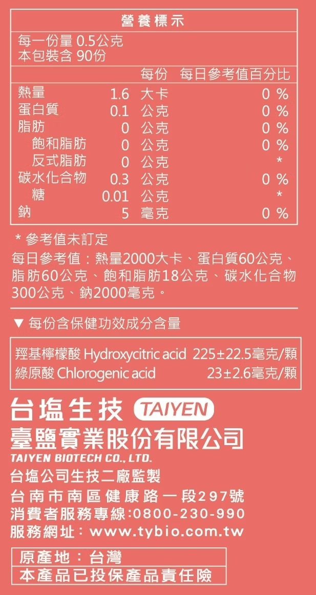 | 商品成分 | 藤黃果萃取粉末、膠囊殼(明膠、純水)、綠咖啡萃取物、膠原蛋白、硬脂酸鎂、二氧化矽。 |