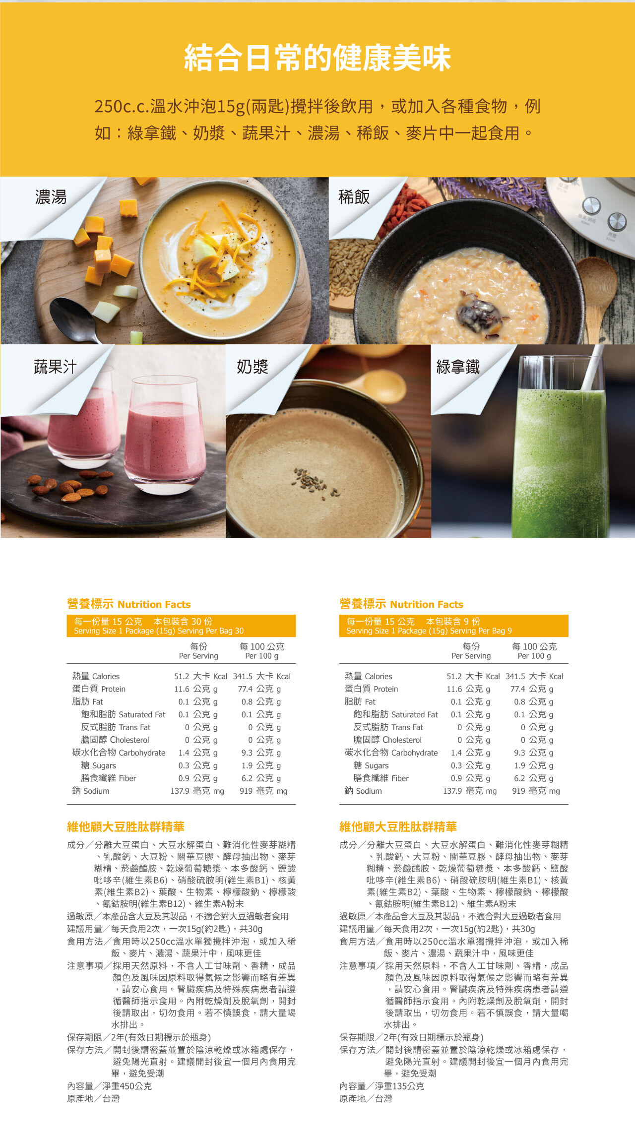 | 商品成分 | 分離大豆蛋白、大豆水解蛋白(大豆胜肽)、難消化性麥芽糊精(水溶性膳食纖維)、乳酸鈣、大豆粉、關華豆膠、酵母抽出物、麥芽糊精、菸鹼醯胺、本多酸鈣、葉酸、葡萄糖、生物素、維生素 B12、維生素 B6、維生素 B1、維生素B2、檸檬酸鐵、偏磷酸鈉、維生素 A |