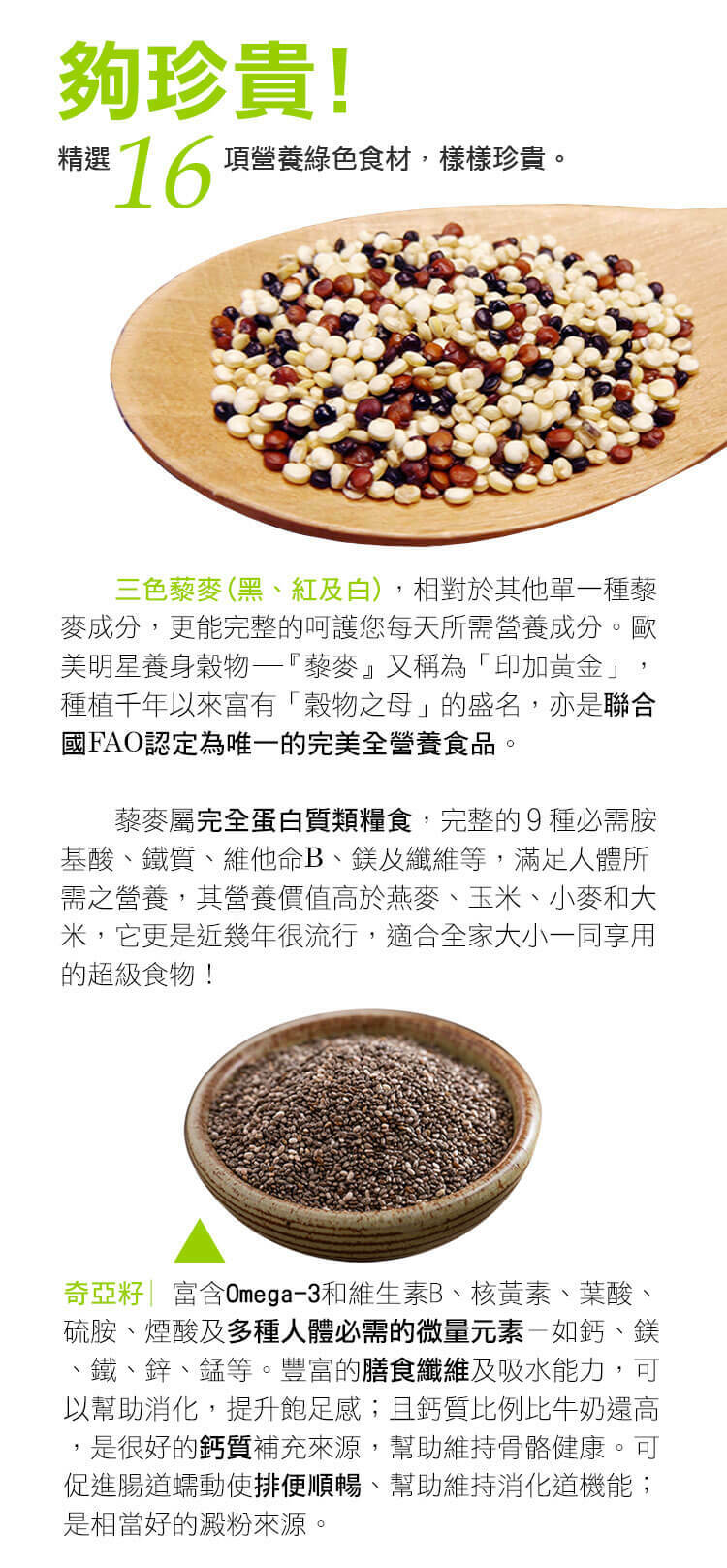 ★採用三色藜麥、藍藻、豌豆蛋白、抹茶(日本靜岡)等16種100%純天然綠色食材製成