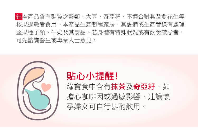 | 注意事項 | 本產品含麩質穀類、大豆、黑芝麻、奇亞籽,不適合對其及對花生等核果過敏體質者食用;本產品生產製程廠房,其設備或生產管線有處理堅果種子類、牛奶及其製品。 |