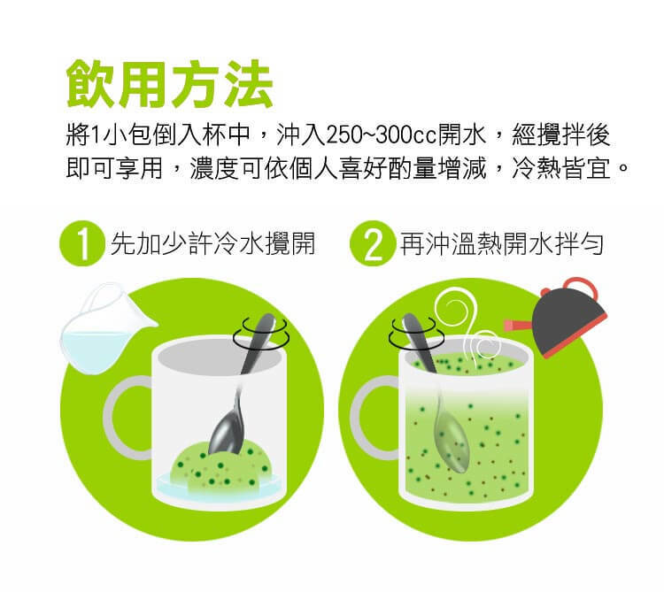 | 食用方式 | 撕開一包倒入杯中,沖入250~300cc之開水,經攪拌後即可享用;濃度可依個人喜好酌量增減,冷熱皆宜。 |