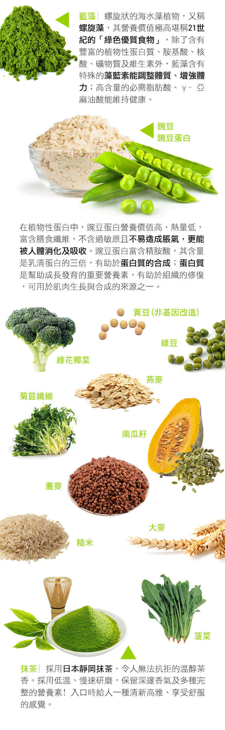 | 商品成分 | 黃豆(非基因改造)、燕麥、糙米、奇亞籽、抹茶(日本靜岡)、菊苣纖維、三色藜麥、豌豆蛋白、綠豆、菠菜、蕎麥、大麥、豌豆、藍藻、南瓜籽、綠花椰菜。 |