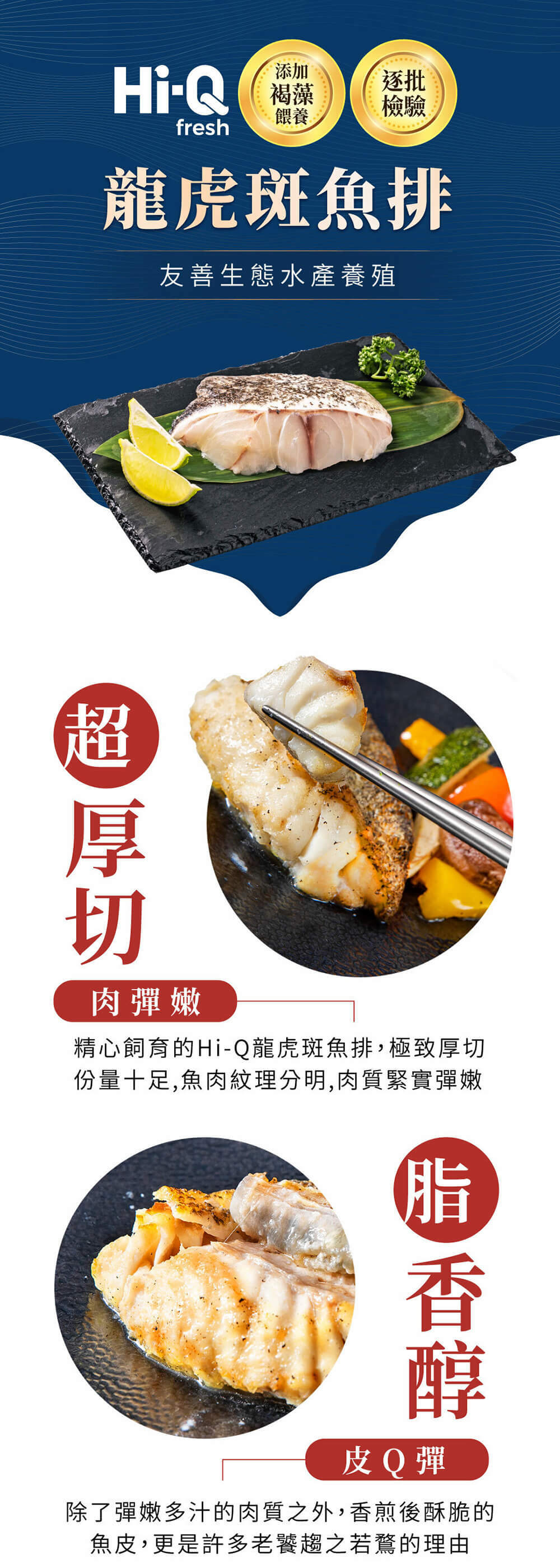 | 商品名稱 | 【Hi-Q健康鱻食】龍虎班魚排(150-200g)x3入+金目鱸魚排(150-200g)x3入(冷凍) |