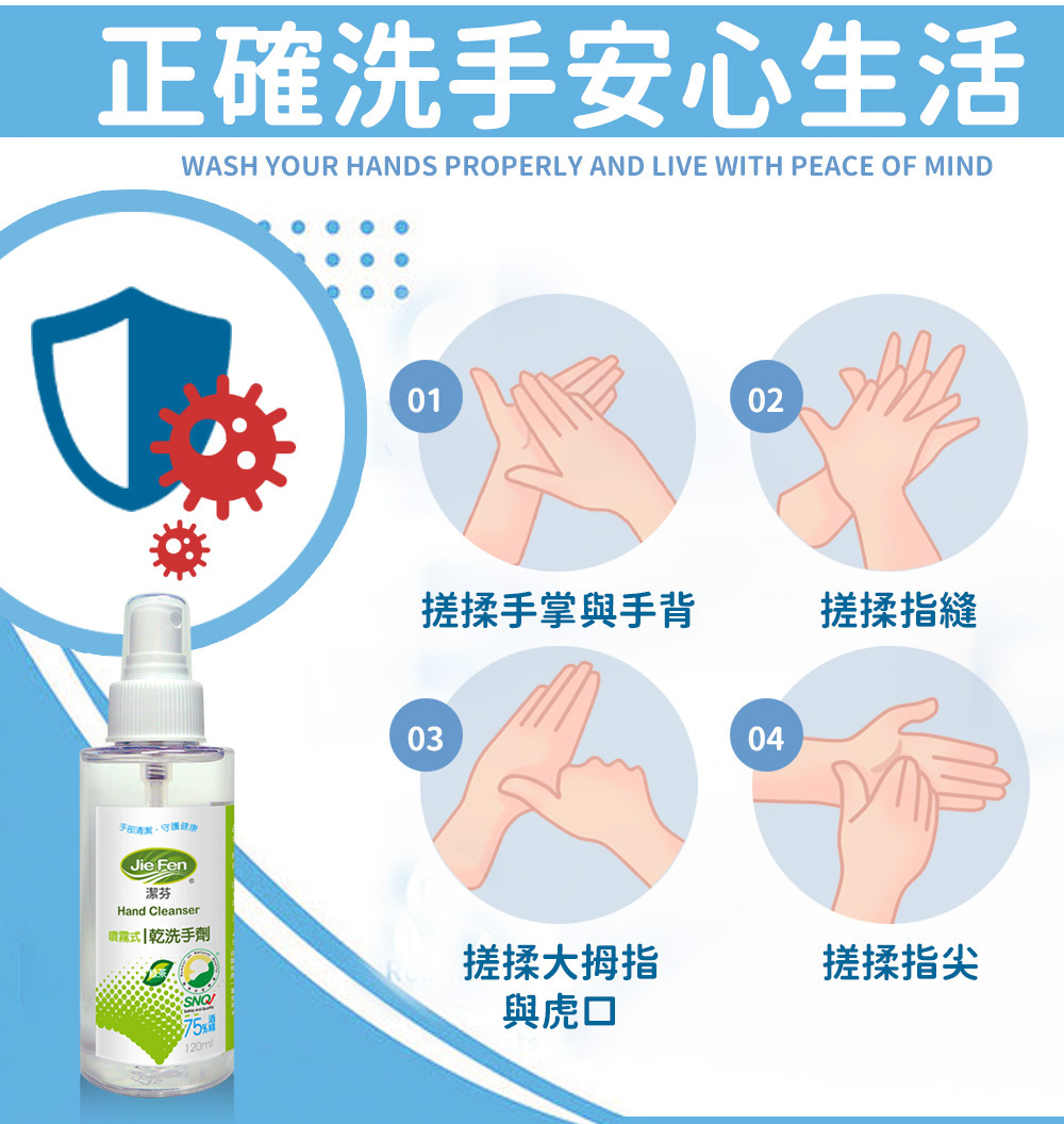 | 使用方式 | 一般人均適用(幼兒使用請大人從旁看護指導使用),均勻噴灑於雙手,輕輕搓揉至完全揮發即可 |