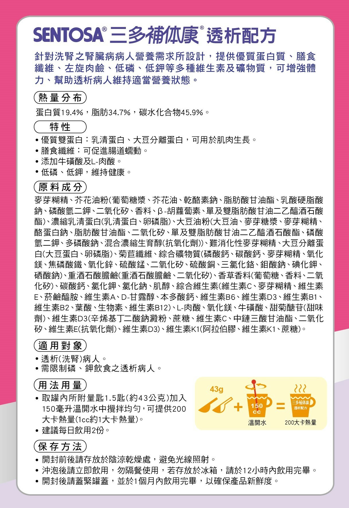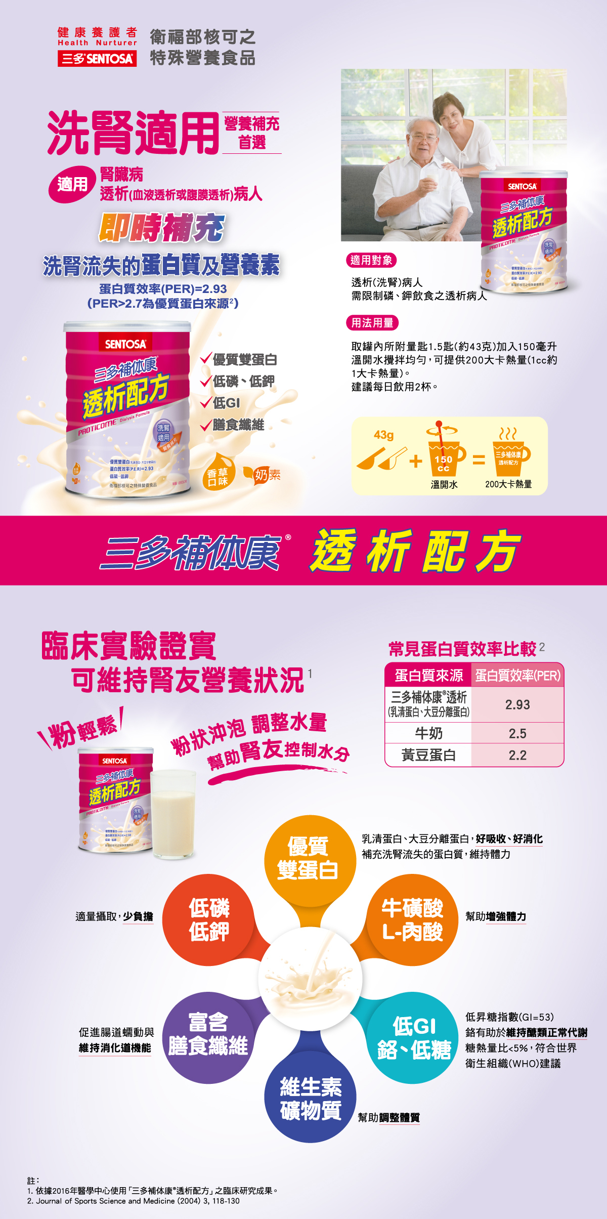 | 適用族群 | .接受透析治療(洗腎)的腎衰竭患者 .洗腎的糖尿病腎病變患者 .限制、磷、鉀及水分攝取患者 |
