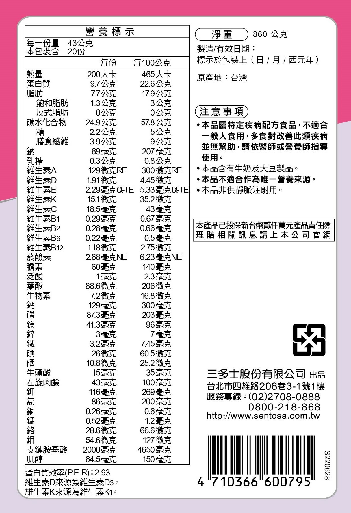 | 商品名稱 | 【SENTOSA 三多】補体康透析配方(860g/罐) |