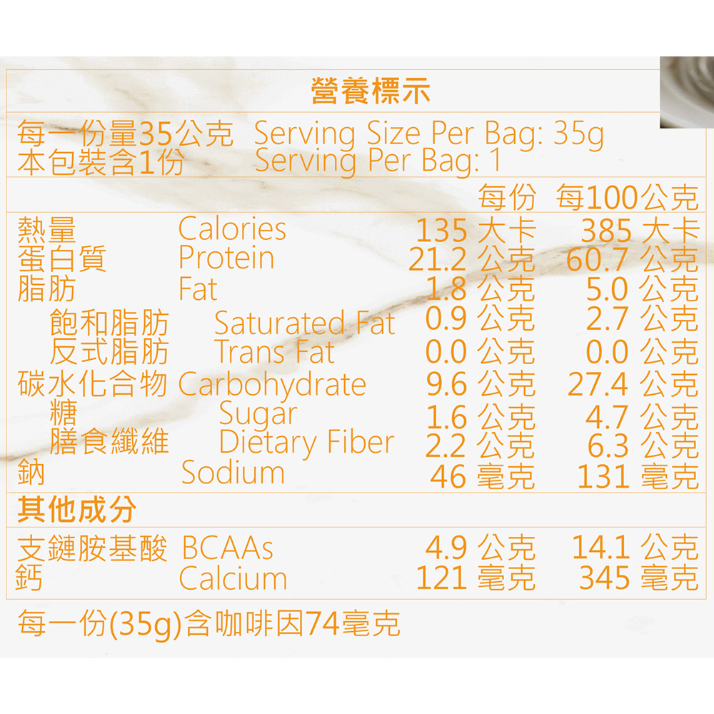 | 商品成分 | 【高鈣-真杏仁】濃縮乳清蛋白、杏仁粉、燕麥粉、紅藻粉(含海藻鈣) 【高纖-黑巧克力咖啡】濃縮乳清蛋白粉、可可粉、難消化性麥芽糊精(含膳食纖維)、咖啡粉 |