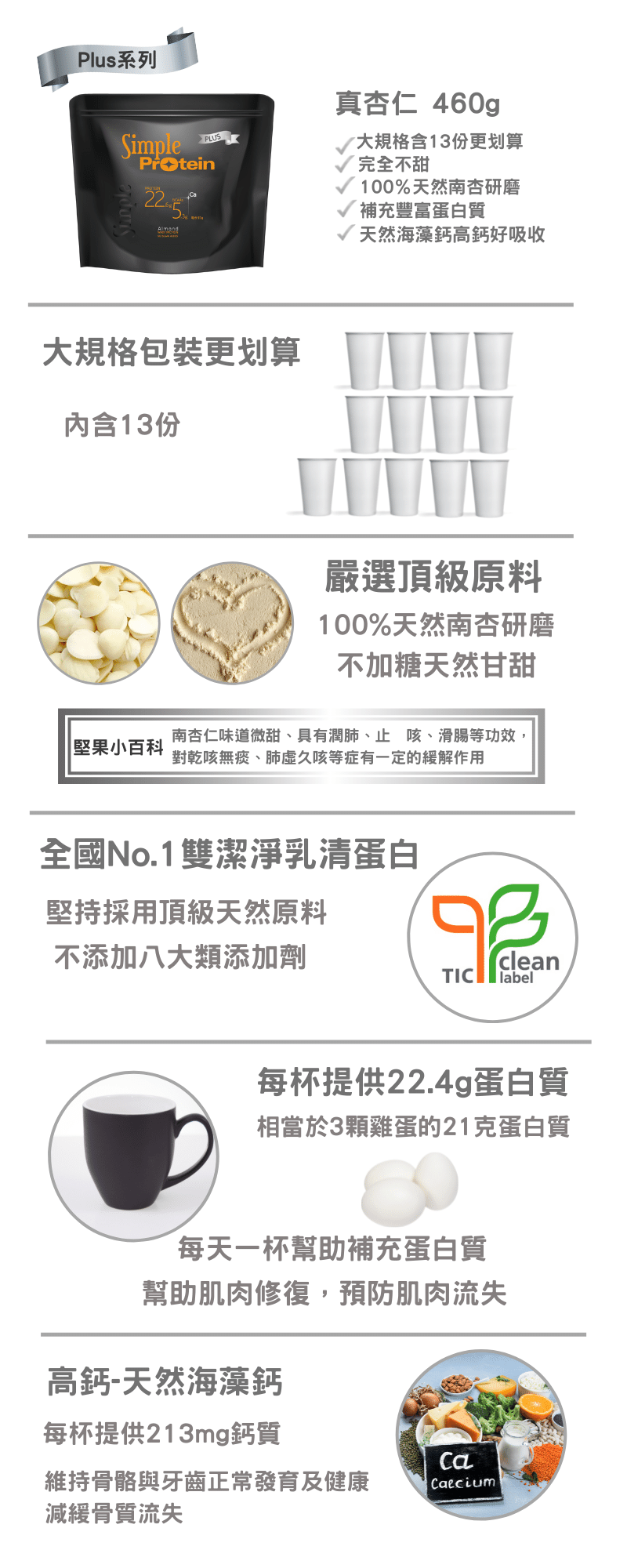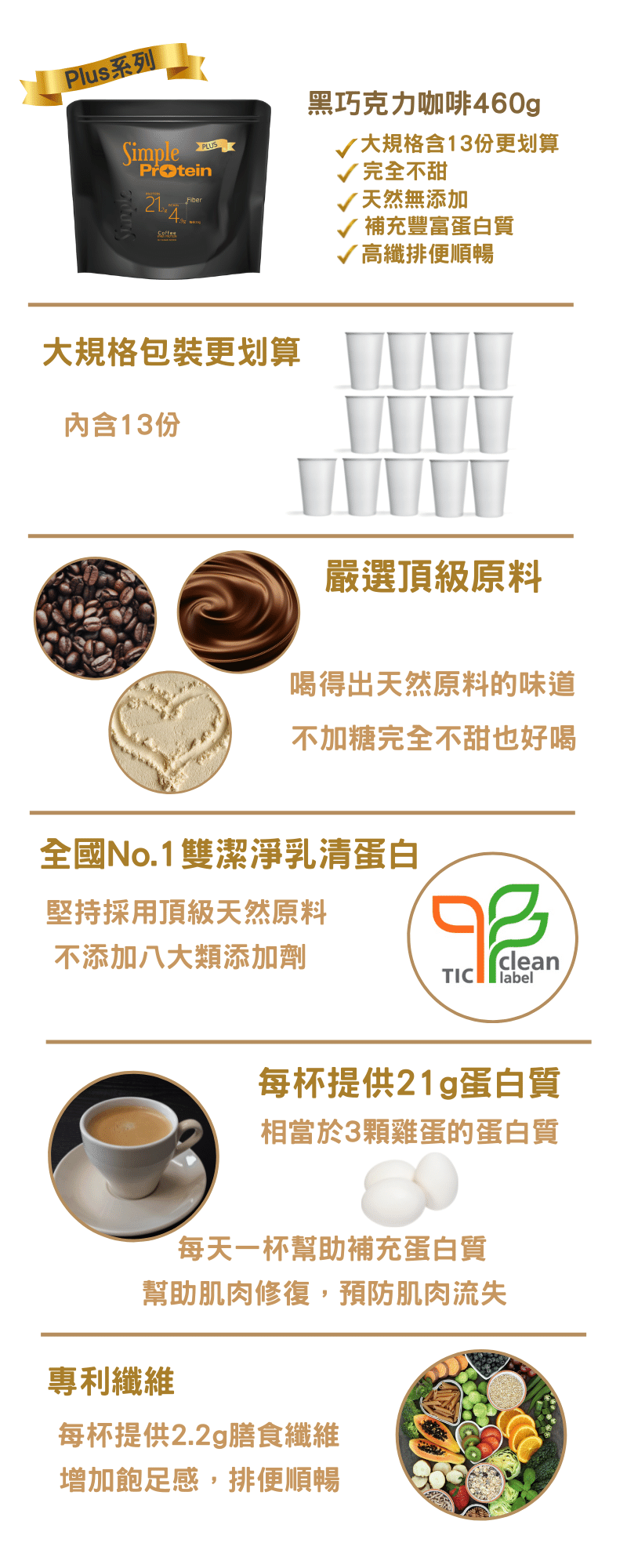 | 商品名稱 | 【Simple Protein】極簡乳清蛋白-PLUS高纖高鈣系列(超值袋裝)x3袋組|口味任選:高纖黑巧克力咖啡/高鈣真杏仁 |
