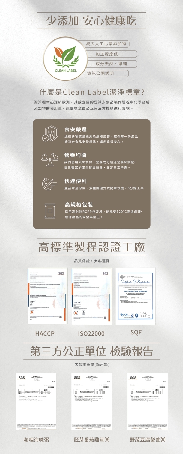 | 注意事項 | 1.採不透氣金屬鋁箔包裝,不可直接微波使用。 2.本產品出廠前經嚴格品質測試合格,若有發生包裝不良或是產品膨脹等現象,請勿食用,立即撥打服務專線,將儘快為您處理。 3.本有效期限指未經拆袋、加熱並保存於一般常溫下,產品一經拆袋不得再置於常溫下。 4.本產品已經通過專業食品單位食品工業發展研究所熱穿透實驗檢測,請安心食用。 5.過敏原資訊 : 本產品含有大豆、蛋及其製品,不適合對其過敏體質者食用 |