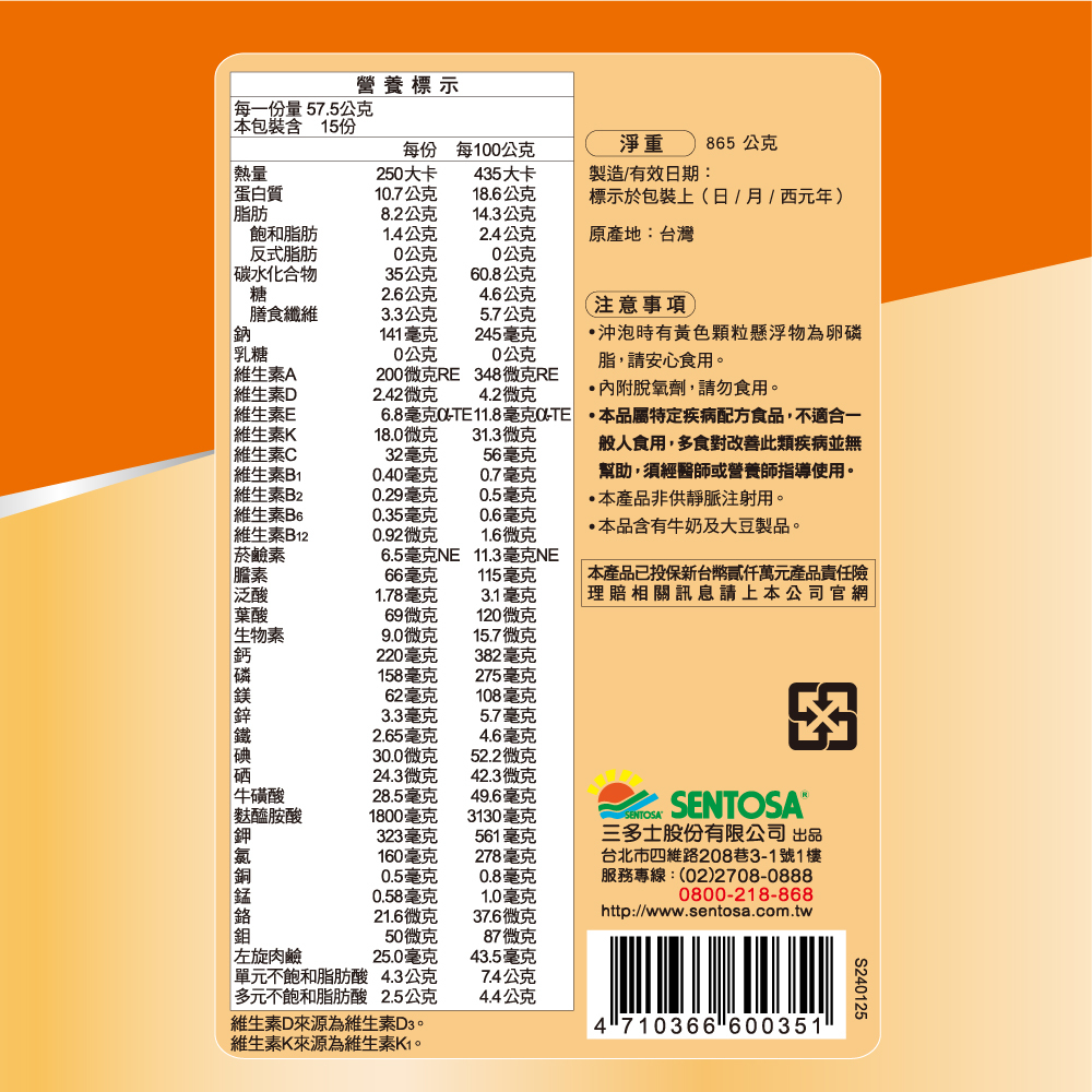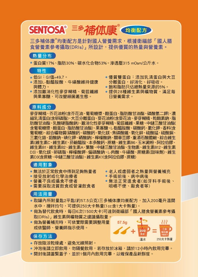 | 適用族群 | 無法於正常飲食中得到足夠熱量者•接受放射或化學治療者•營養不良或攝食不便者•需要採取流質飲食或管灌飲食者•老人或虛弱者之熱量與營養補充•手術前後、病中病後•無法正常進食者(如牙科手術後、咀嚼不便、厭食者等) |