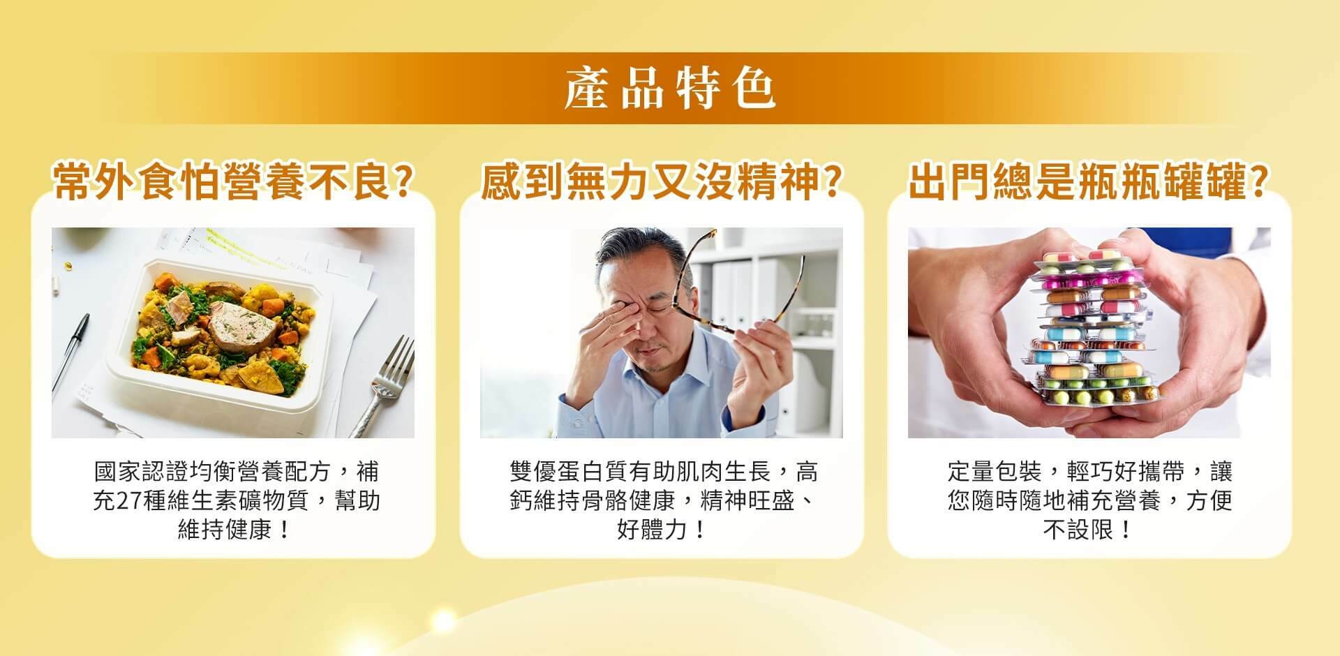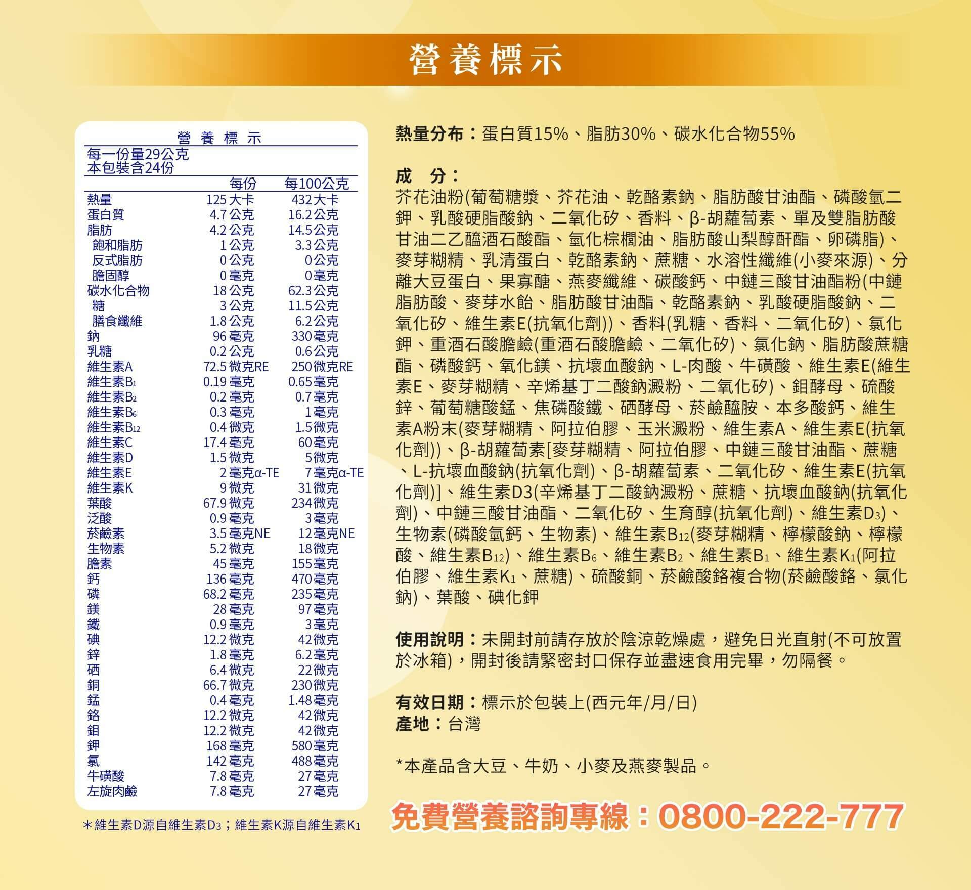 | 商品成分 | 芥花油粉(葡萄糖漿、芥花油、乾酪素鈉、脂肪酸甘油酯、磷酸氫二鉀、乳酸硬脂酸鈉、二氧化矽、香料、β-胡蘿蔔素、單及雙脂肪酸甘油二乙醯酒石酸酯、氫化棕櫚油、脂肪酸山梨醇酐酯、卵磷脂)、麥芽糊精、乳清蛋白、乾酪素鈉、蔗糖、水溶性纖維(小麥來源)、分離大豆蛋白、果寡醣、燕麥纖維、碳酸鈣、中鏈三酸甘油酯粉(中鏈脂肪酸、麥芽水飴、脂肪酸甘油酯、乾酪素鈉、乳酸硬脂酸鈉、二氧化矽、維生素E(抗氧化劑))、香料(乳糖、香料、二氧化矽)、氯化鉀、重酒石酸膽鹼(重酒石酸膽鹼、二氧化矽)、氯化鈉、脂肪酸蔗糖酯、磷酸鈣、氧化鎂、抗壞血酸鈉、L-肉酸、牛磺酸、維生素E(維生素E、麥芽糊精、辛烯基丁二酸鈉澱粉、二氧化矽)、鉬酵母、硫酸鋅、葡萄糖酸錳、焦磷酸鐵、硒酵母、菸鹼醯胺、本多酸鈣、維生素A粉末(麥芽糊精、阿拉伯膠、玉米澱粉、維生素A、維生素E(抗氧化劑))、β-胡蘿蔔素[麥芽糊精、阿拉伯膠、中鏈三酸甘油酯、蔗糖、L-抗壞血酸鈉(抗氧化劑)、β-胡蘿蔔素、二氧化矽、維生素E(抗氧化劑)]、維生素D3(辛烯基丁二酸鈉澱粉、蔗糖、抗壞血酸鈉(抗氧化劑)、中鏈三酸甘油酯、二氧化矽、生育醇(抗氧化劑)、維生素D3)、生物素(磷酸氫鈣、生物素)、維生素B12(麥芽糊精、檸檬酸鈉、檸檬酸、維生素B12)、維生素B6、維生素B2、維生素B1、維生素K1(阿拉伯膠、維生素K1、蔗糖)、硫酸銅、菸鹼酸鉻複合物(菸鹼酸鉻、氯化鈉)、葉酸、碘化鉀 |