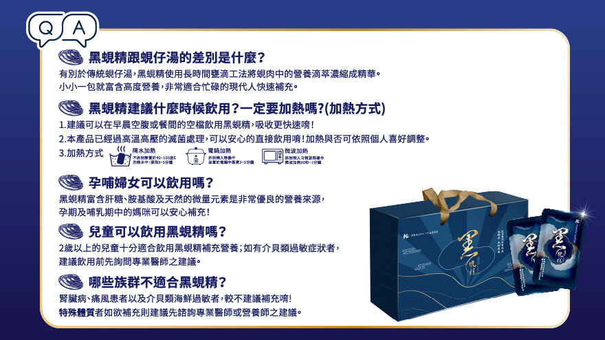 4. 本產品為天然黑蜆萃取,如有沉澱屬正常情形請搖晃均勻後飲用。
