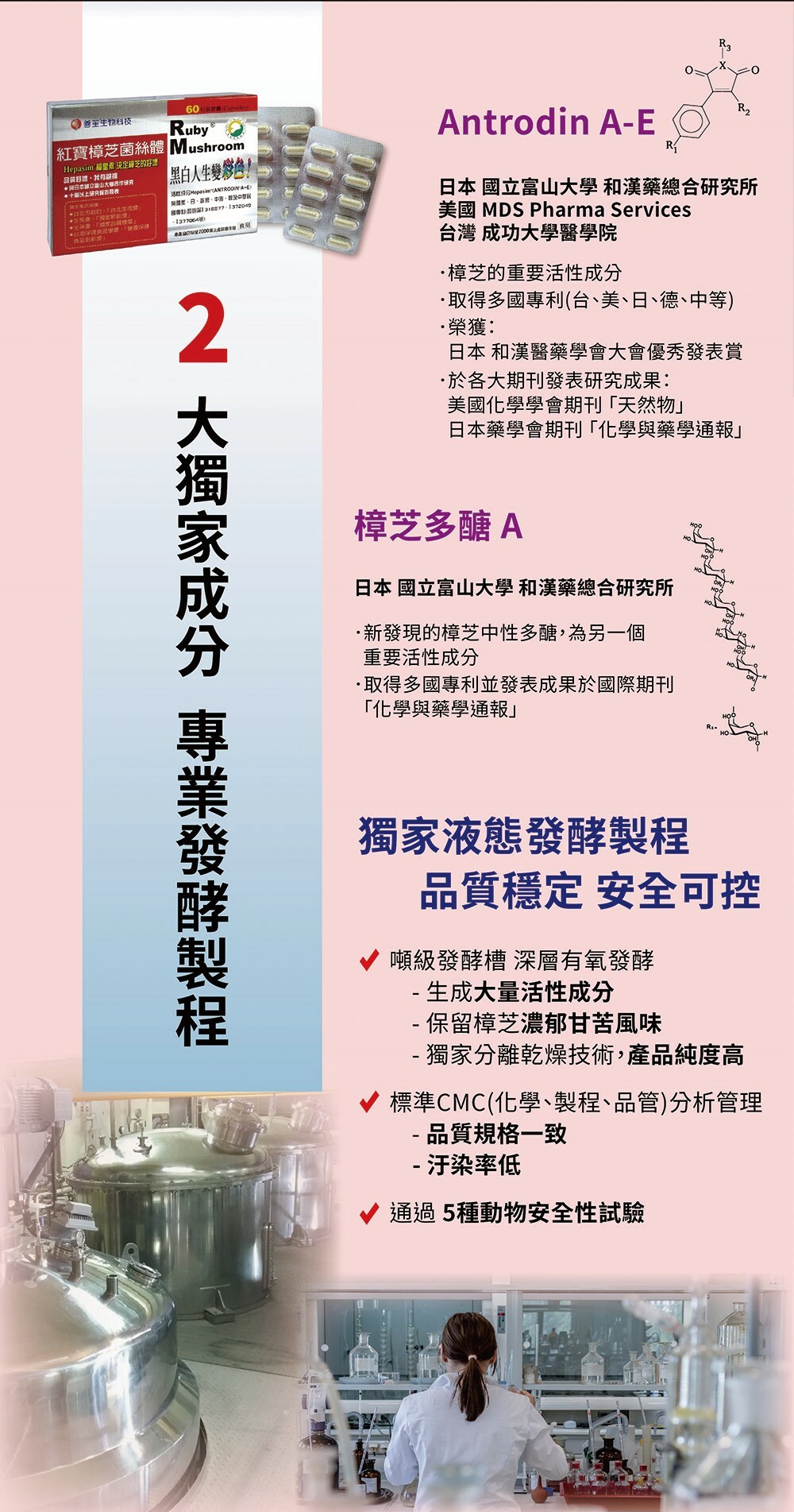 | 商品成分 | 【成分】發酵菌絲體(Antrodia cinnamomea)(液態培養) 【素膠囊成分】羥丙基甲基纖維素、純水、鹿角菜膠、氯化鉀