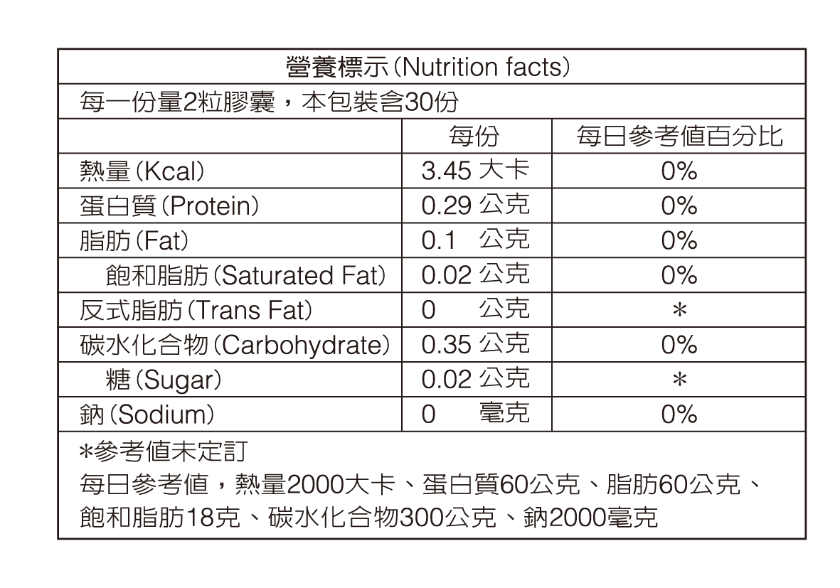 | 注意事項 | 嬰幼兒、孕婦、哺餵母乳者,如欲食用本品請洽詢醫師或醫療專業人員。本品不建議孕婦食用。 |