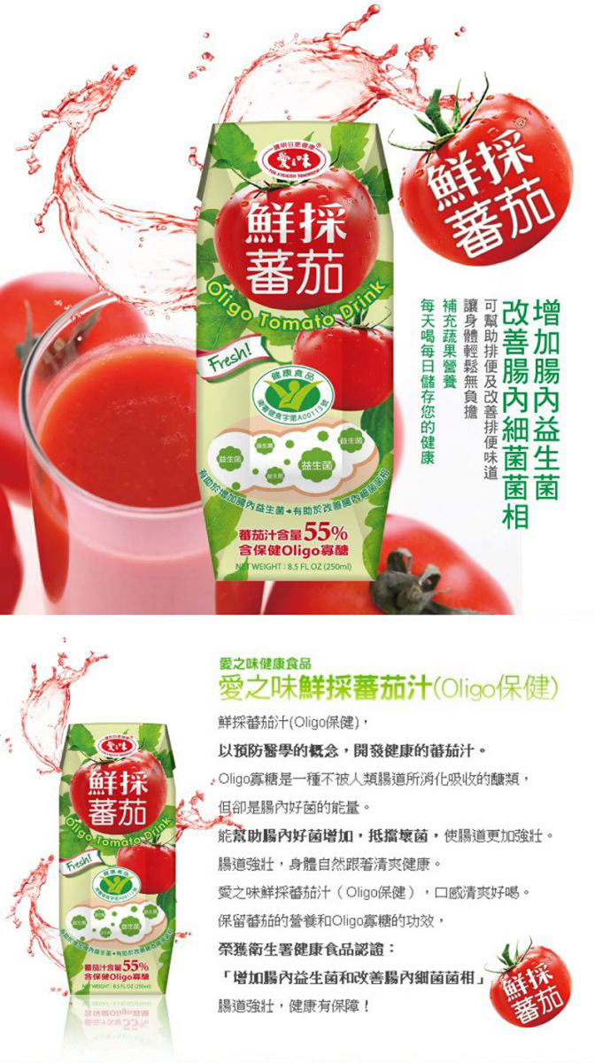 | 商品名稱 | 【愛之味】鮮採蕃茄汁Oligo保健 利樂包250ml |