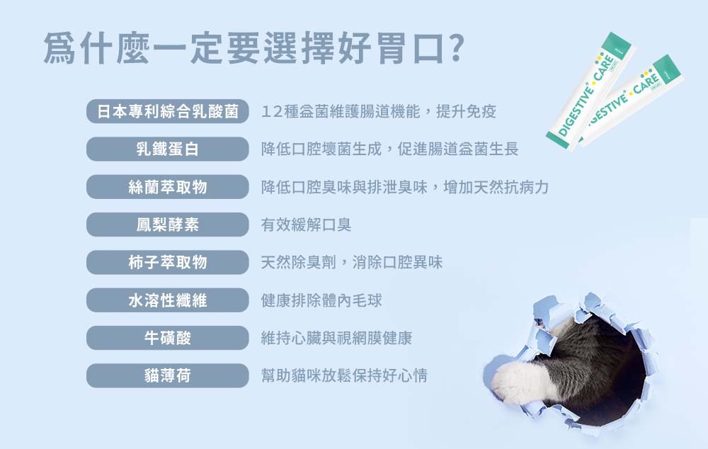 | 商品成分 | 牛磺酸、玉米來源可溶性纖維、專利綜合乳酸菌 (麥芽糊精、嗜酸乳桿菌Lactobacillus acidophilus、長雙歧桿菌Bifidobacterium longum、動物雙歧桿菌 Bifidobacterium animalis、短雙歧桿菌Bifidobacterium breve、兩歧雙歧桿菌Bifidobacterium bifidium、乾酪乳桿菌Lactobacillus casei、保加利亞乳桿菌Lactobacillus bulgaricus、植物乳桿菌Lactobacillus plantarum、鼠李糖乳桿菌Lactobacillus rhamnosus、副乾酪乳桿菌Lactobacillus paracasei、嗜熱鏈球菌Streptococcus thermophilus、瑞士乳桿菌Lactobacillus helveticus)、鳳梨精華含鳳梨酵素、麥芽糊精、葡萄糖 、雞肉粉、絲蘭萃取物、貓薄荷粉、香料、綜合消化酵素 (澱粉分解酵素、乳糖分解酵素、蛋白質分解酵素、脂肪分解酵素、纖維素分解酵素、麥芽糊精)、乳鐵蛋白、日本專利柿子萃取物 |