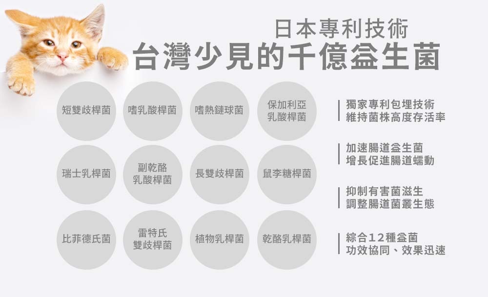 | 商品成分 | 牛磺酸、玉米來源可溶性纖維、專利綜合乳酸菌 (麥芽糊精、嗜酸乳桿菌Lactobacillus acidophilus、長雙歧桿菌Bifidobacterium longum、動物雙歧桿菌 Bifidobacterium animalis、短雙歧桿菌Bifidobacterium breve、兩歧雙歧桿菌Bifidobacterium bifidium、乾酪乳桿菌Lactobacillus casei、保加利亞乳桿菌Lactobacillus bulgaricus、植物乳桿菌Lactobacillus plantarum、鼠李糖乳桿菌Lactobacillus rhamnosus、副乾酪乳桿菌Lactobacillus paracasei、嗜熱鏈球菌Streptococcus thermophilus、瑞士乳桿菌Lactobacillus helveticus)、鳳梨精華含鳳梨酵素、麥芽糊精、葡萄糖 、雞肉粉、絲蘭萃取物、貓薄荷粉、香料、綜合消化酵素 (澱粉分解酵素、乳糖分解酵素、蛋白質分解酵素、脂肪分解酵素、纖維素分解酵素、麥芽糊精)、乳鐵蛋白、日本專利柿子萃取物 |