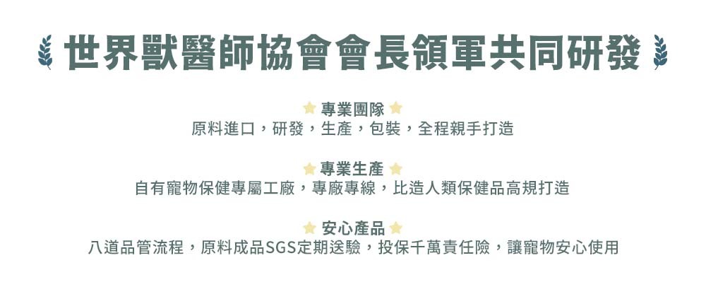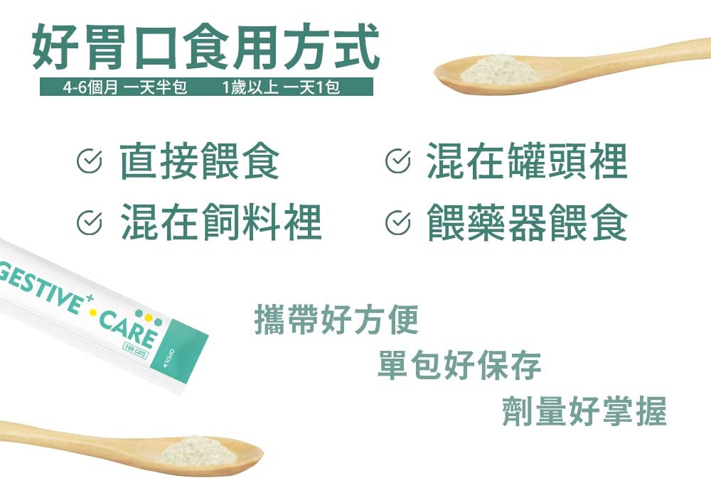 | 食用方式 | 1.體重< 10 kg,每日給予1包;體重≧10 kg,每日給予2~3包2.直接食用或添加至飼料中 |