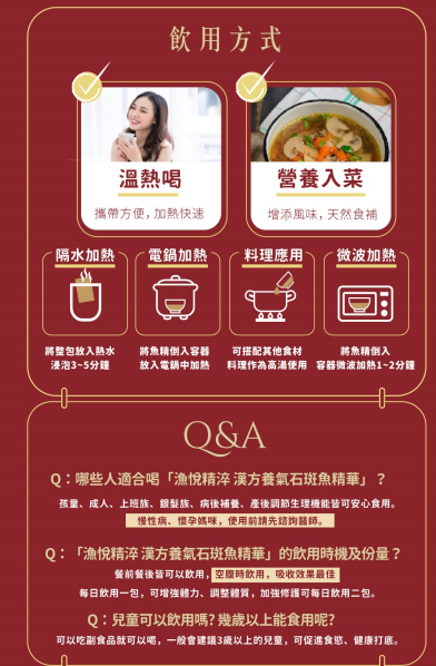 | 食用方式 | 每日1包,滋補強身。 加強保養可每日飲用2包。