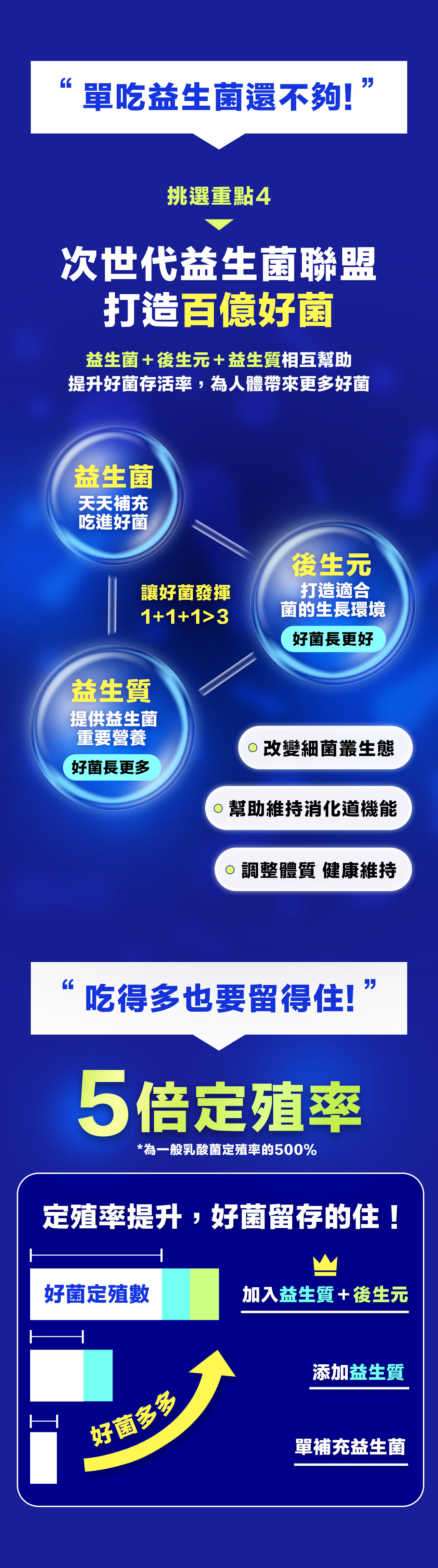★益生菌 + 益生質 + 後生元 次世代益菌聯盟,打造百億好菌!