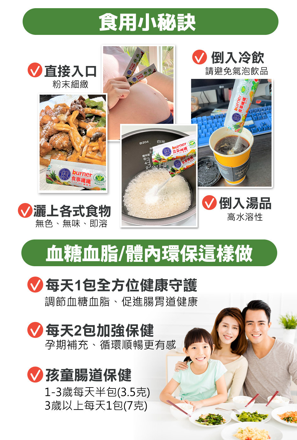 | 食用方式 | 1.建議每天一次,每次一包,建議餐前服用。 2.可直接口服或添加於各式冷、熱飲品、湯品中 3.早上空腹建議加入400c.c.的常溫水使用 |