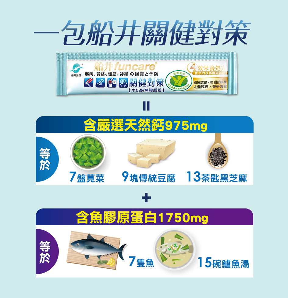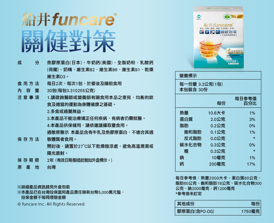 | 商品成分 | 魚膠原蛋白(日本)、牛奶鈣(美國)、全脂奶粉、乳酸鈣(荷蘭)、奶精、維生素B2、維生素B6、維生素B1、乾燥維生素D3 |