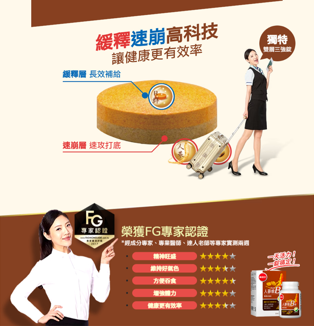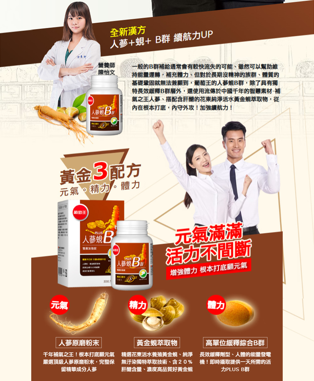 | 商品成分 | 複方黃金蜆萃取物(黃金蜆萃取物、麥芽糊精、玉米澱粉)、羥丙基甲基纖維素、核黃素(維生素B2)、鹽酸口比哆辛(維生素B6)、微結晶狀α-纖維素、複方聚乙二醇(聚乙二醇、二丁基羥基甲苯(抗氧化劑))、麥芽糖粉、人蔘粉、鹽酸硫胺明(維生素B1)、菸鹼醯胺、本多酸鈣、硬脂酸鎂、羥丙基纖維素、二氧化矽、氰鈷胺明(維生素B12)、葉酸、生物素 |