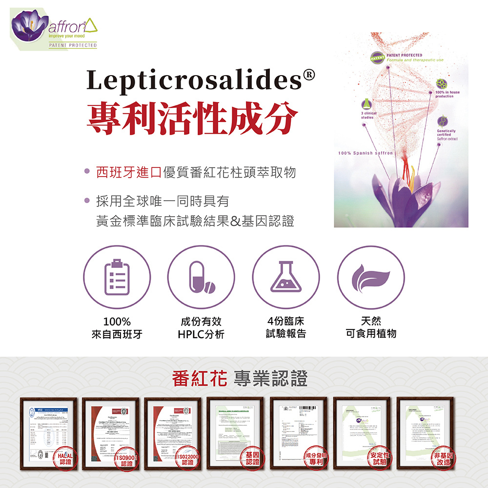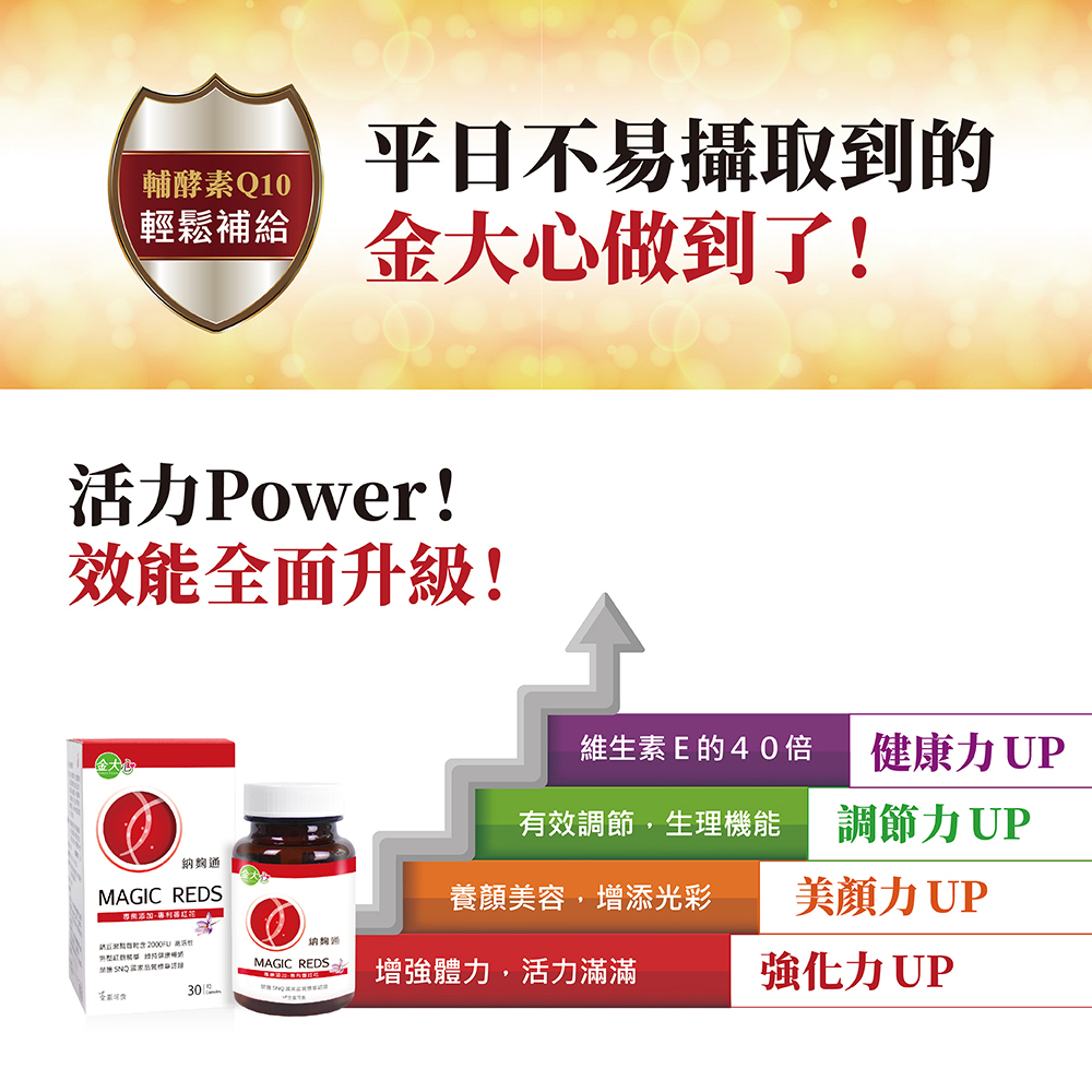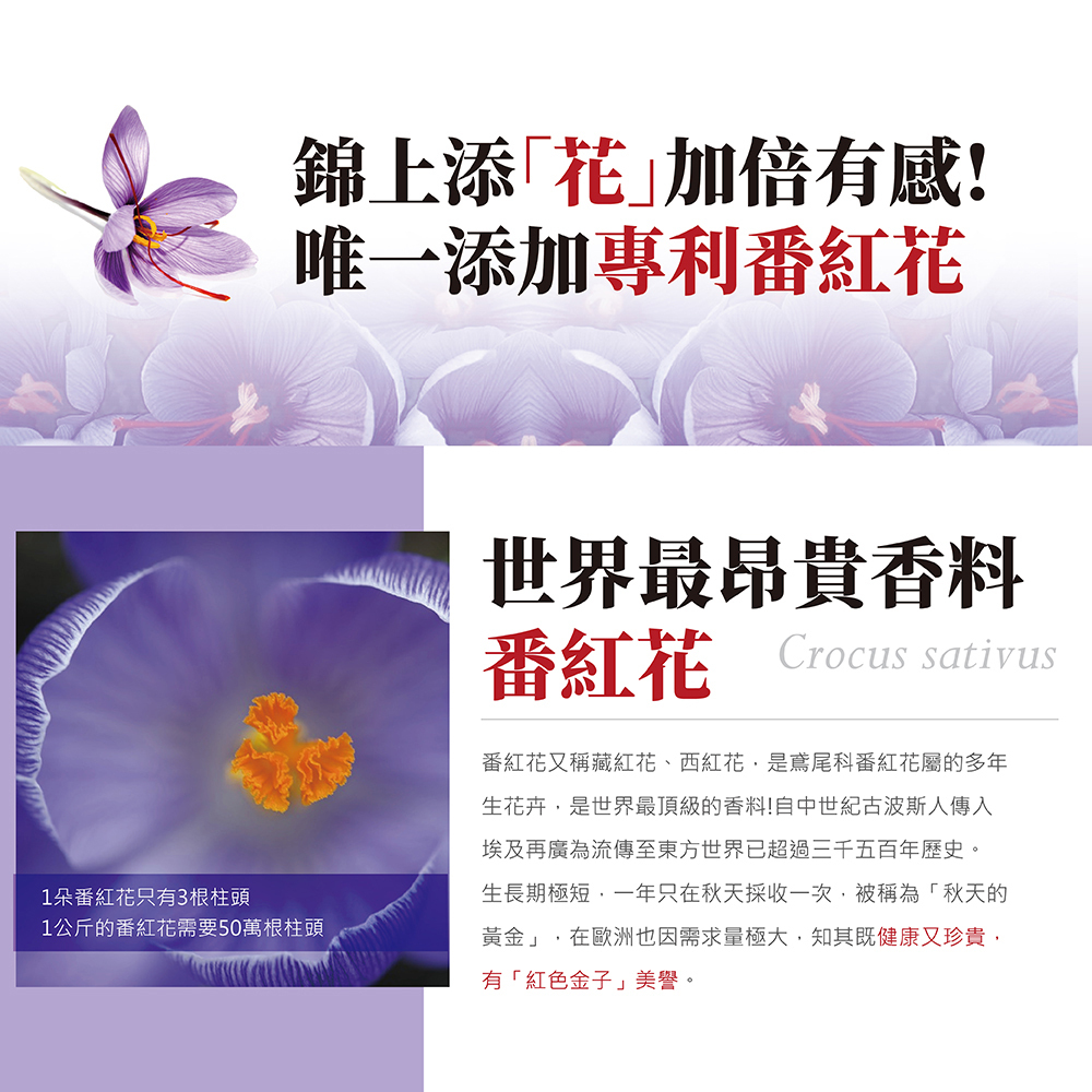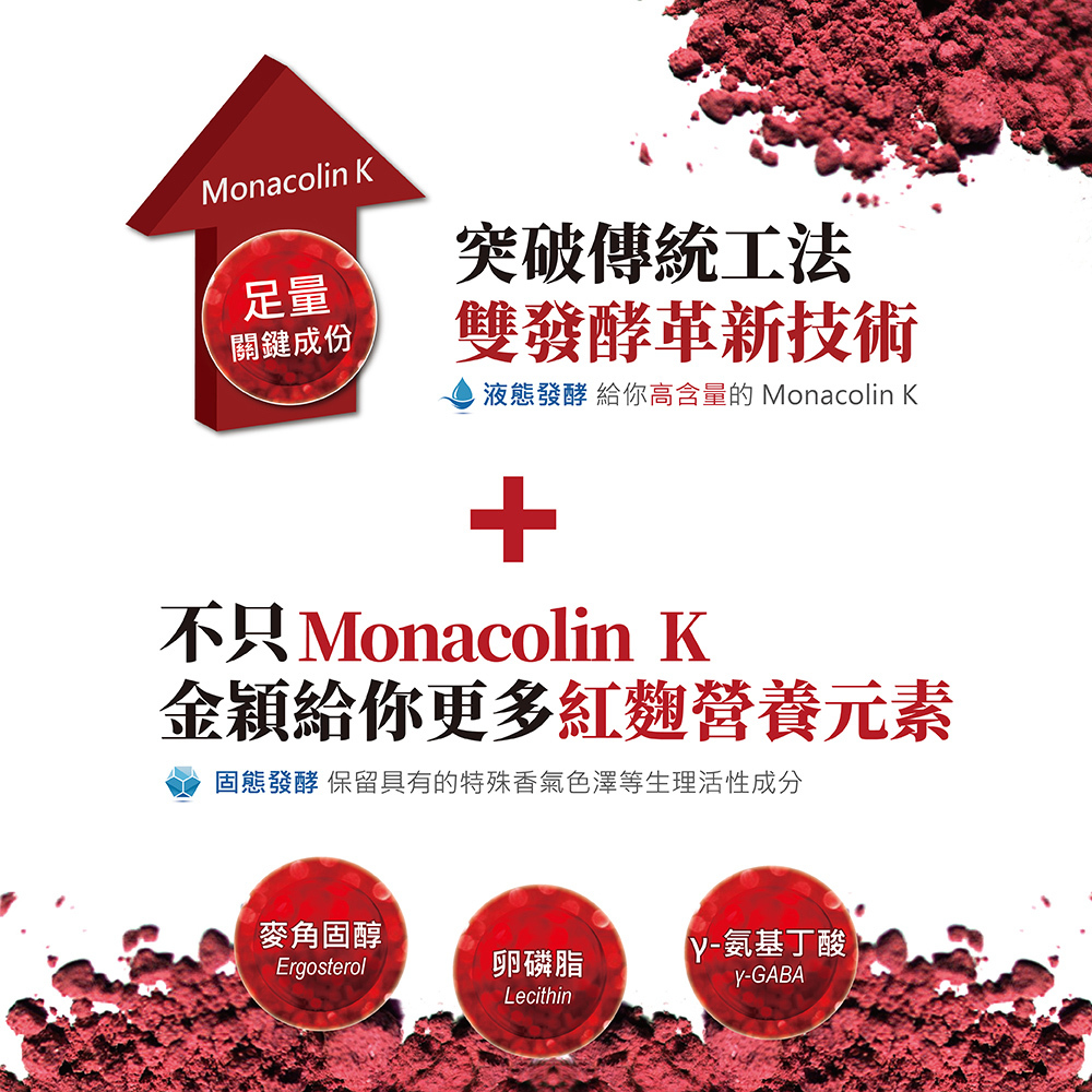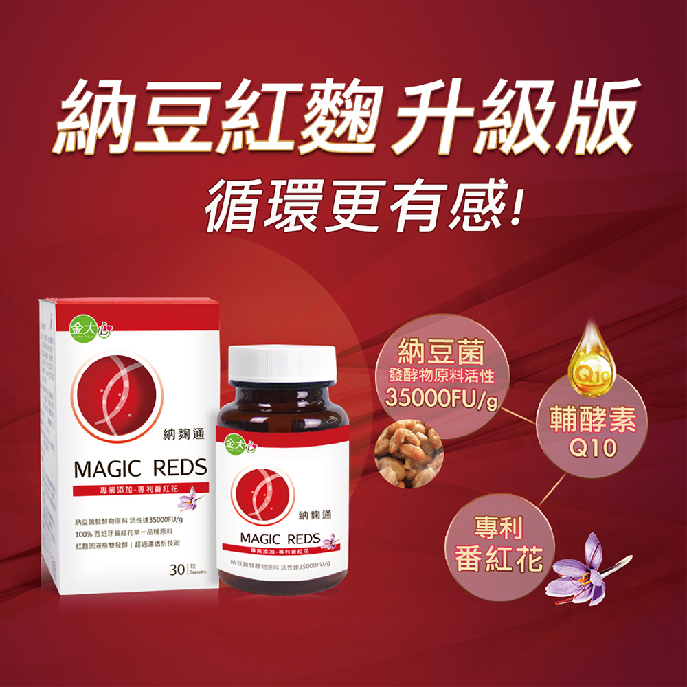 | 商品成分 | 紅麴粉末、丹參萃取物、納豆發酵粉末(納豆菌發酵物(含納豆激酶) 、麥芽糊精、微結晶狀α-纖維素)、野山芋提取物、輔酵素Q10、affron®番紅花萃取物、維生素B2。 膠囊成分:植物性膠囊(羥丙基甲基纖維素、純水、鹿角菜膠、食用紅色六號、二氧化鈦、氯化鉀、食用藍色一號)。